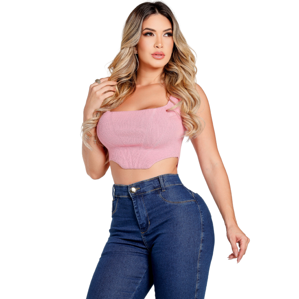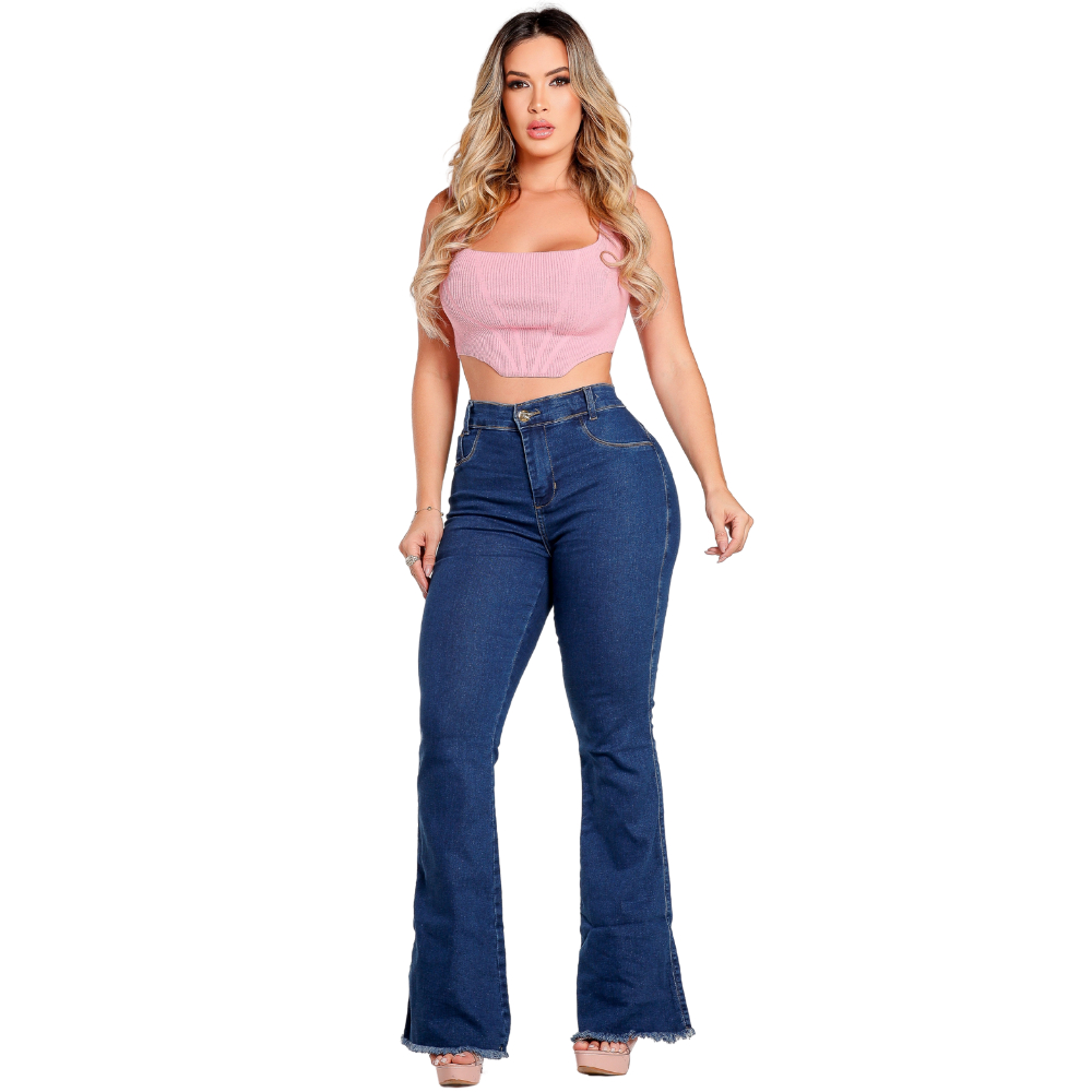 Calça Flare Jeans Azul Barra Desfiada Cós Alto Modelagem Empina Bumbum Lycra