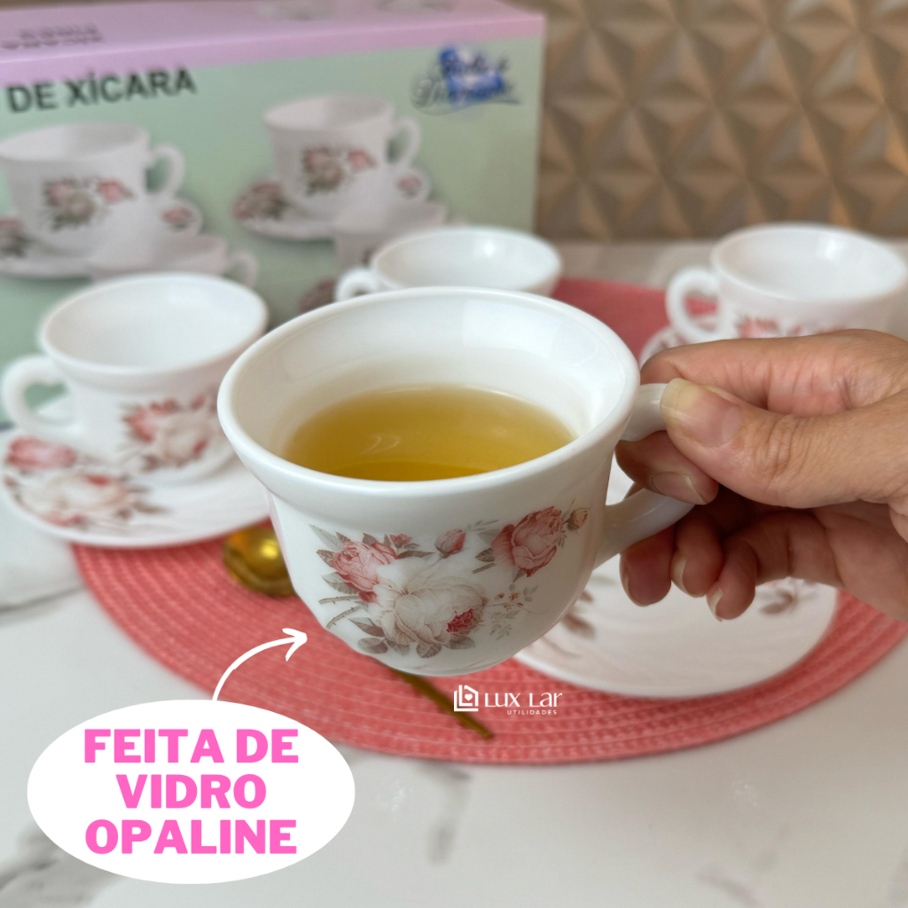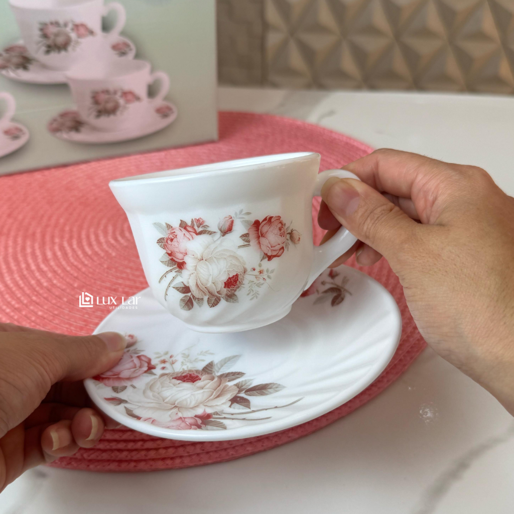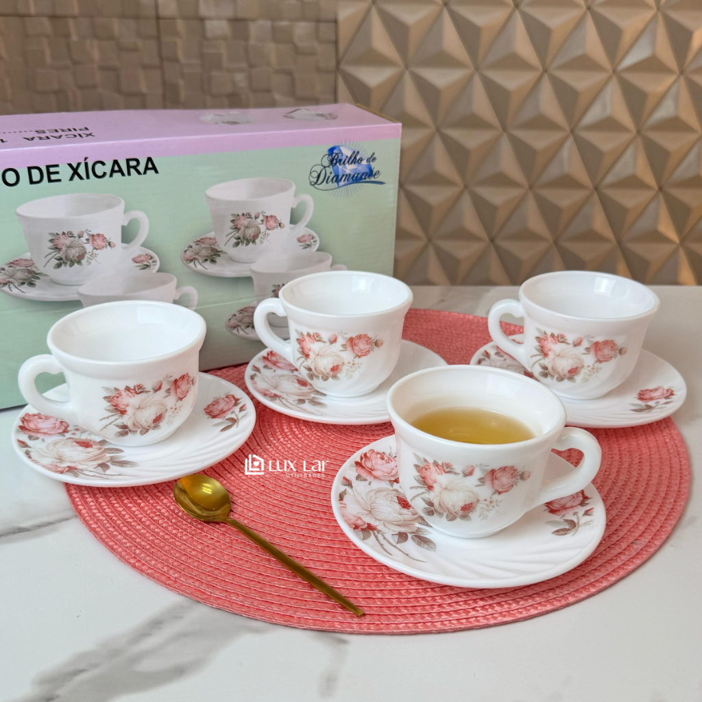 Jogo de Xicaras para Café Chá com Pires 8 peças de Vidro 190ml Estampada Opaline luxo