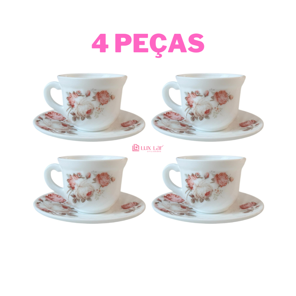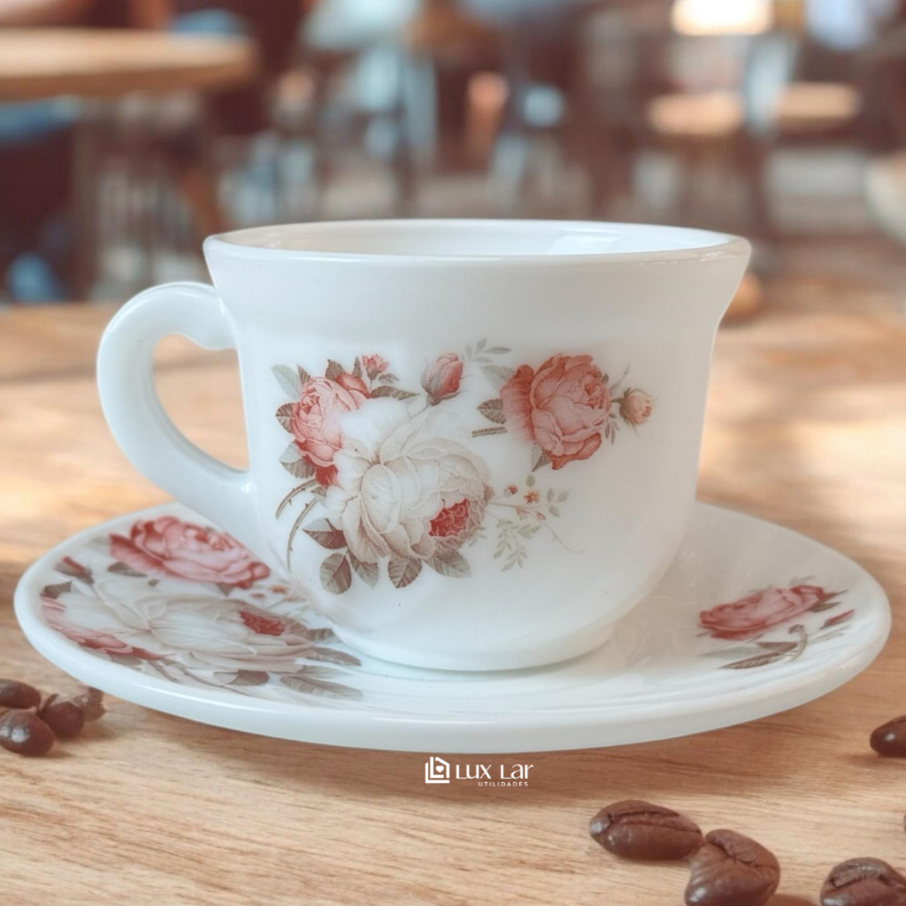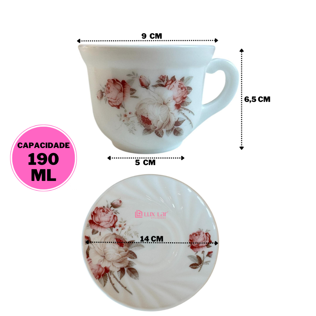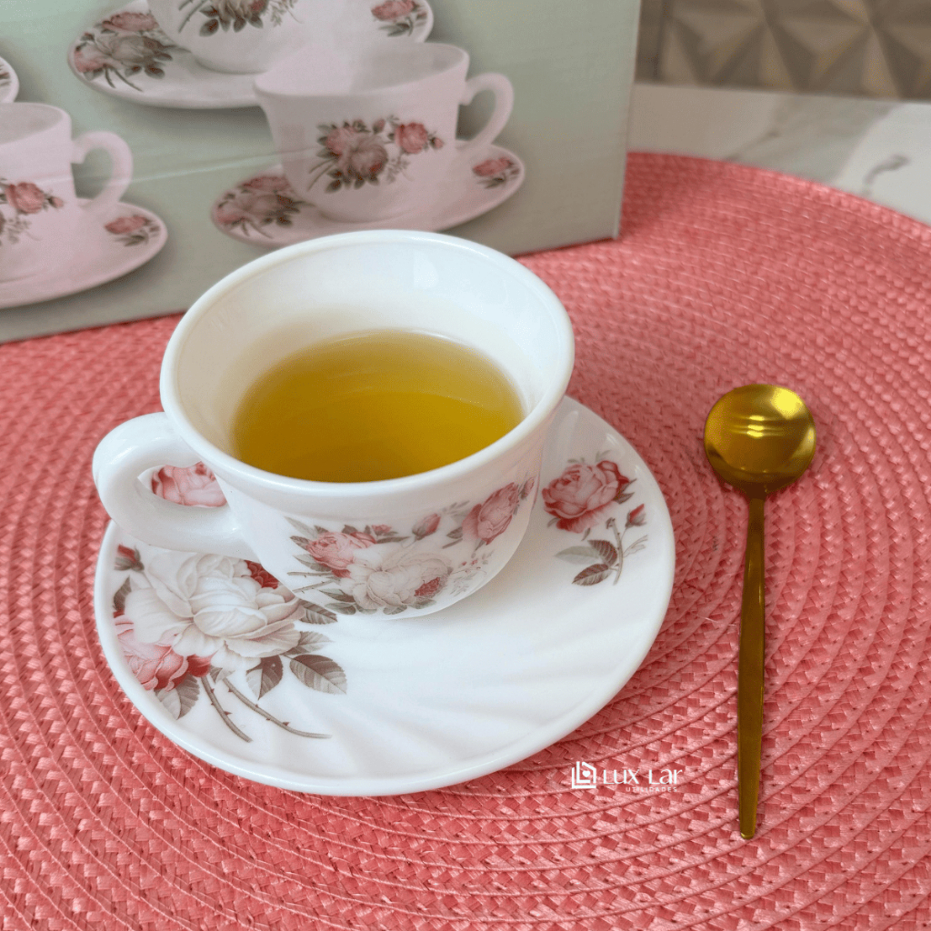 Jogo de Xicaras para Café Chá com Pires 8 peças de Vidro 190ml Estampada Opaline luxo