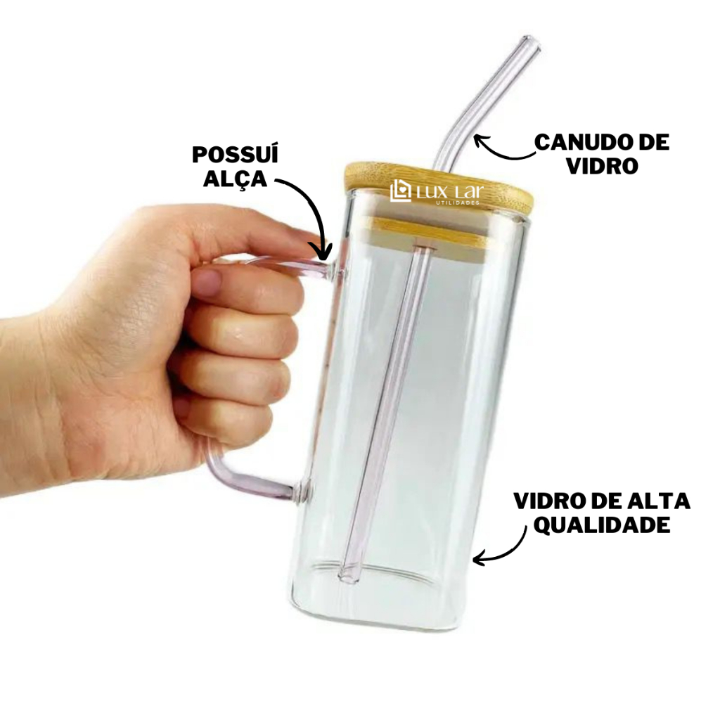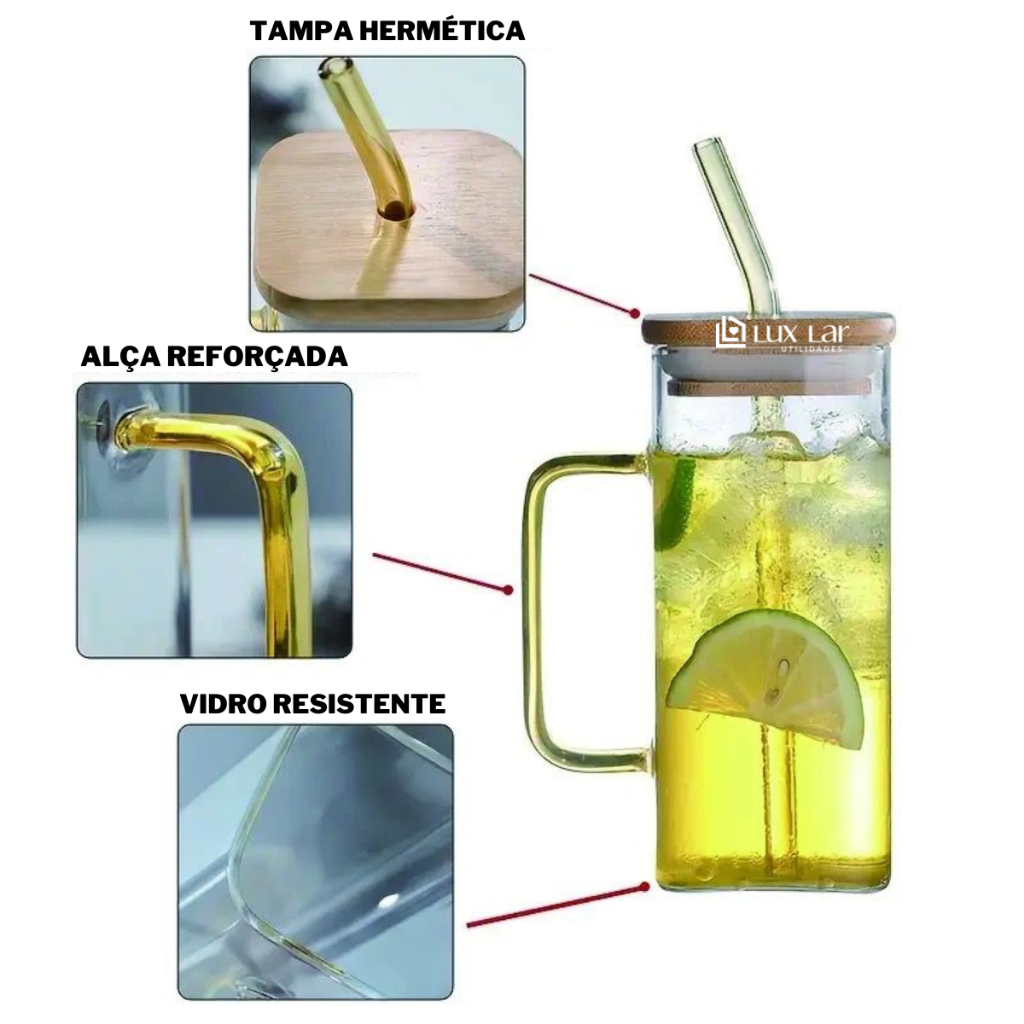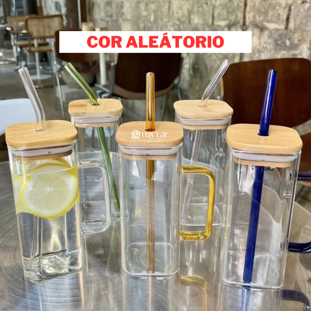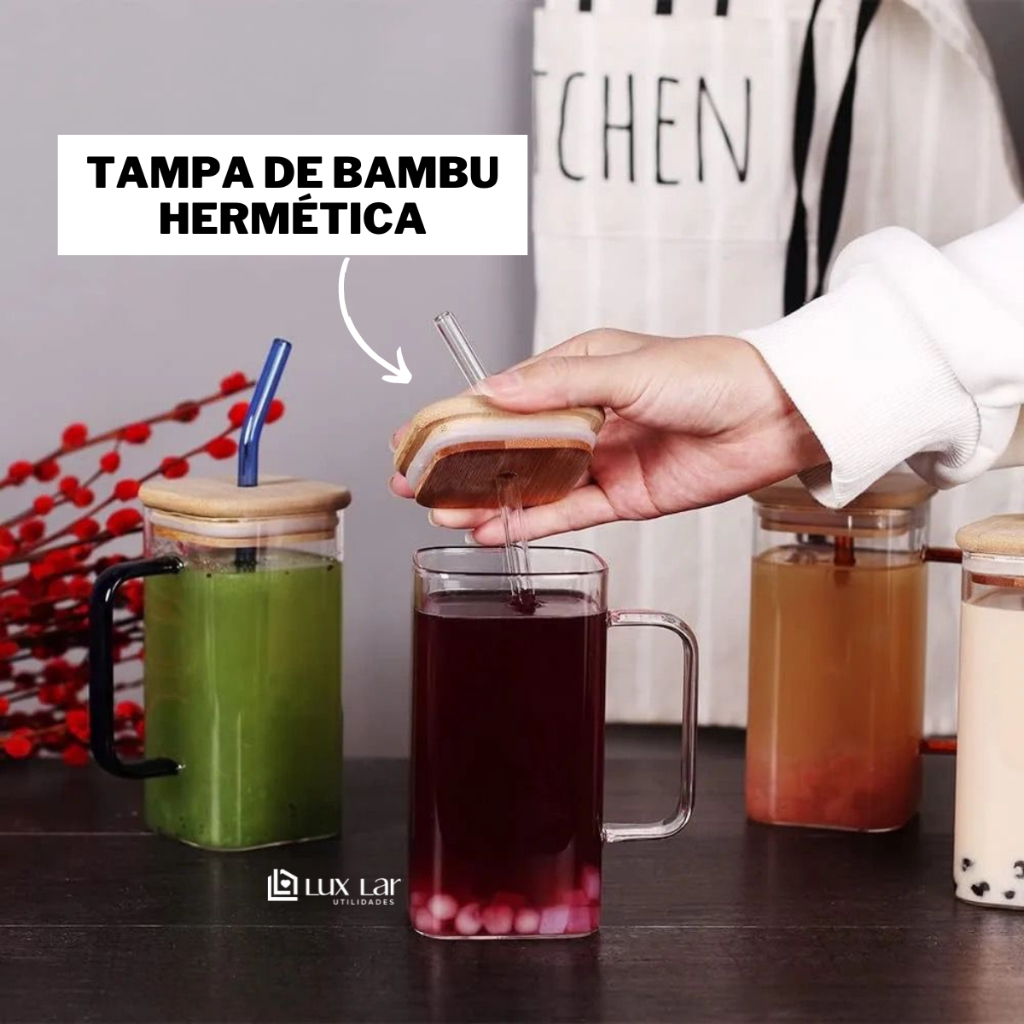 Copo de Vidro com Canudo tampa de Bambu Hermético 350ml Resistente