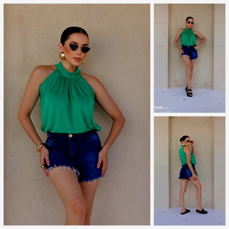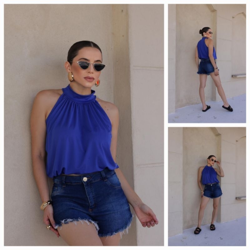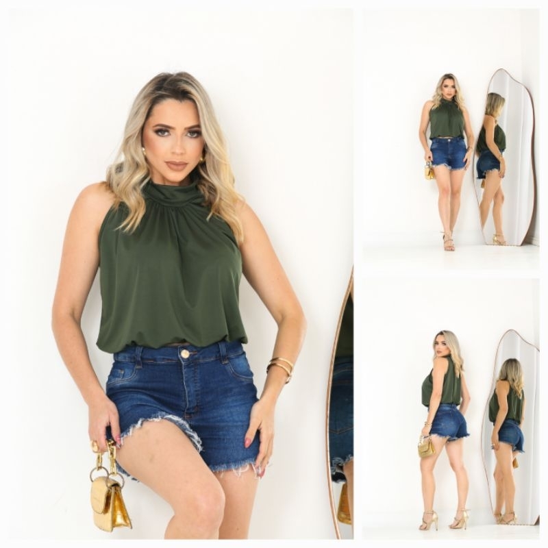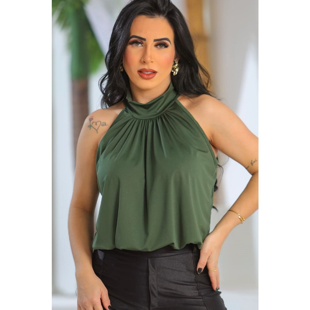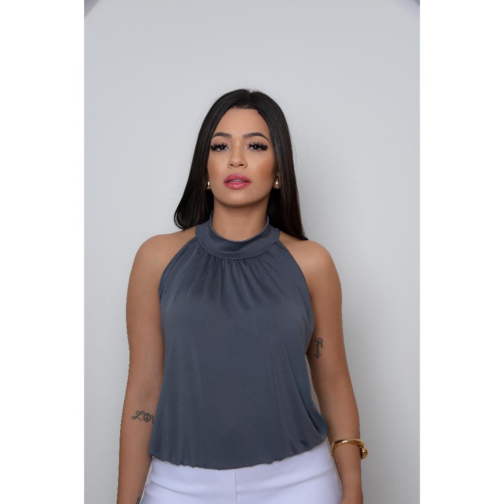 Blusa Regata Gola Alta Com Detalhe Franzido na Gola