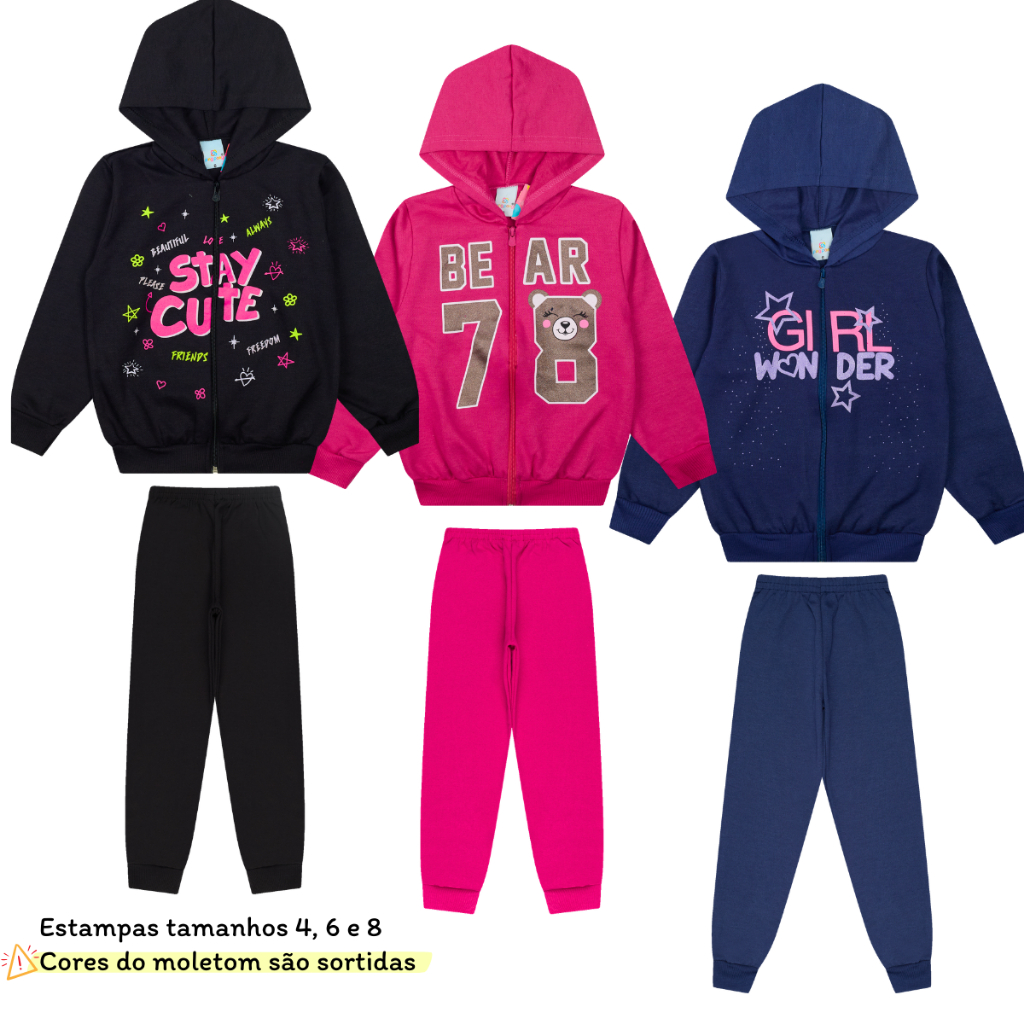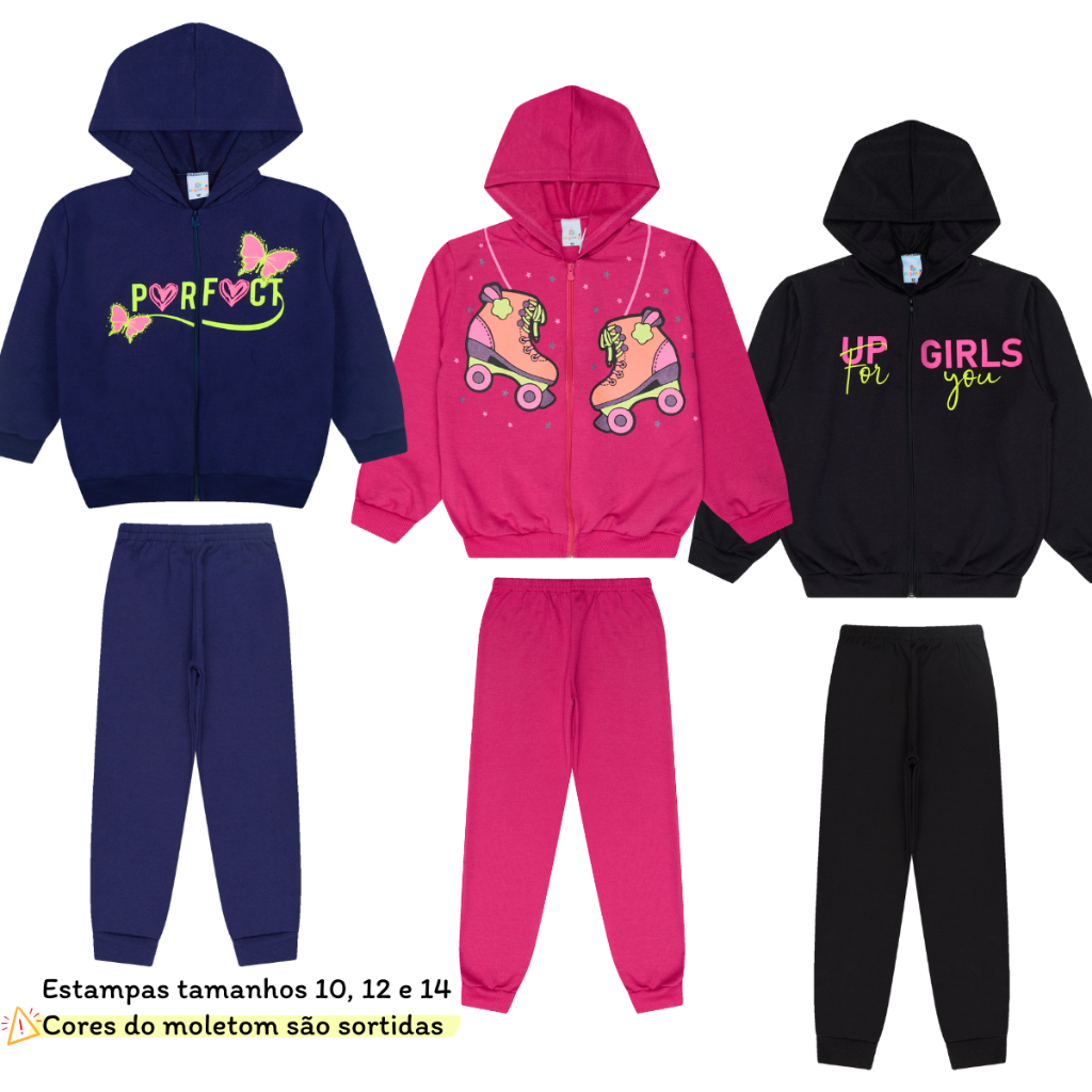 Kit Sortido 6 Peças Moletom Infantil Menina Juvenil Feminino em Promoção com Zíper - 3 Jaquetas + 3 Calças Peluciada