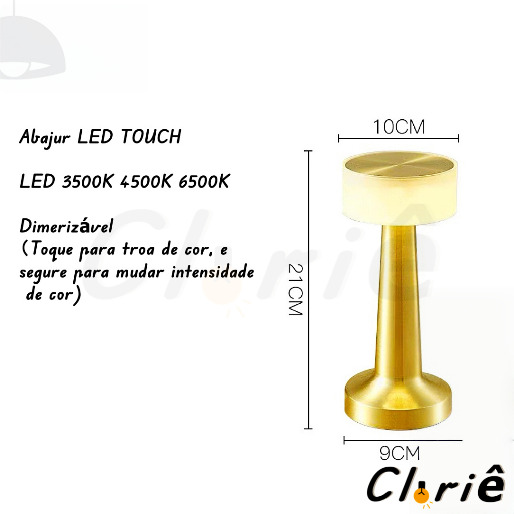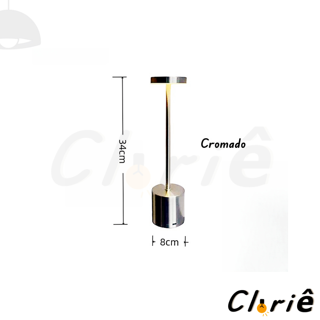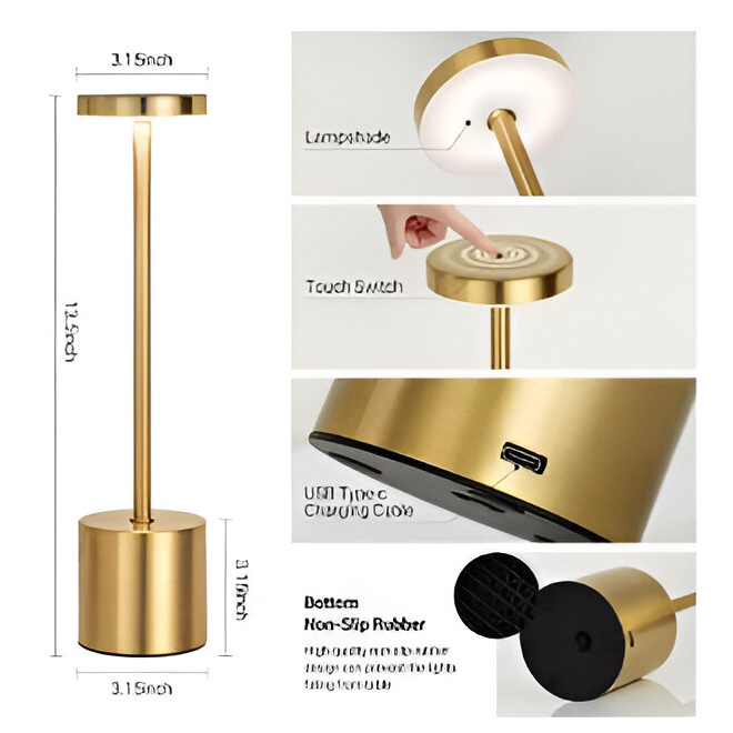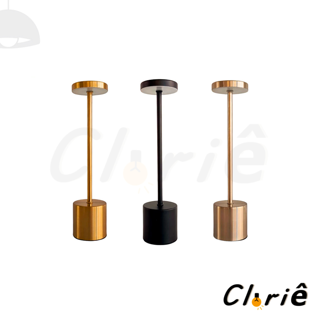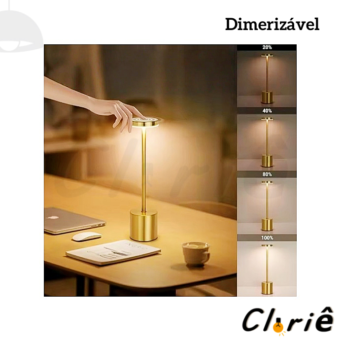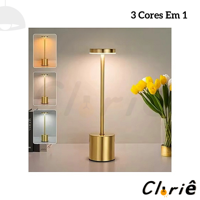 Luminária de Mesa Abajur Cabeceira Escrivaninha LED 3 em 1 Recarregável Tipo C Preto Cromado Dourado