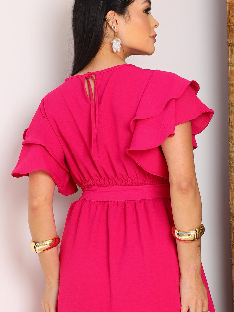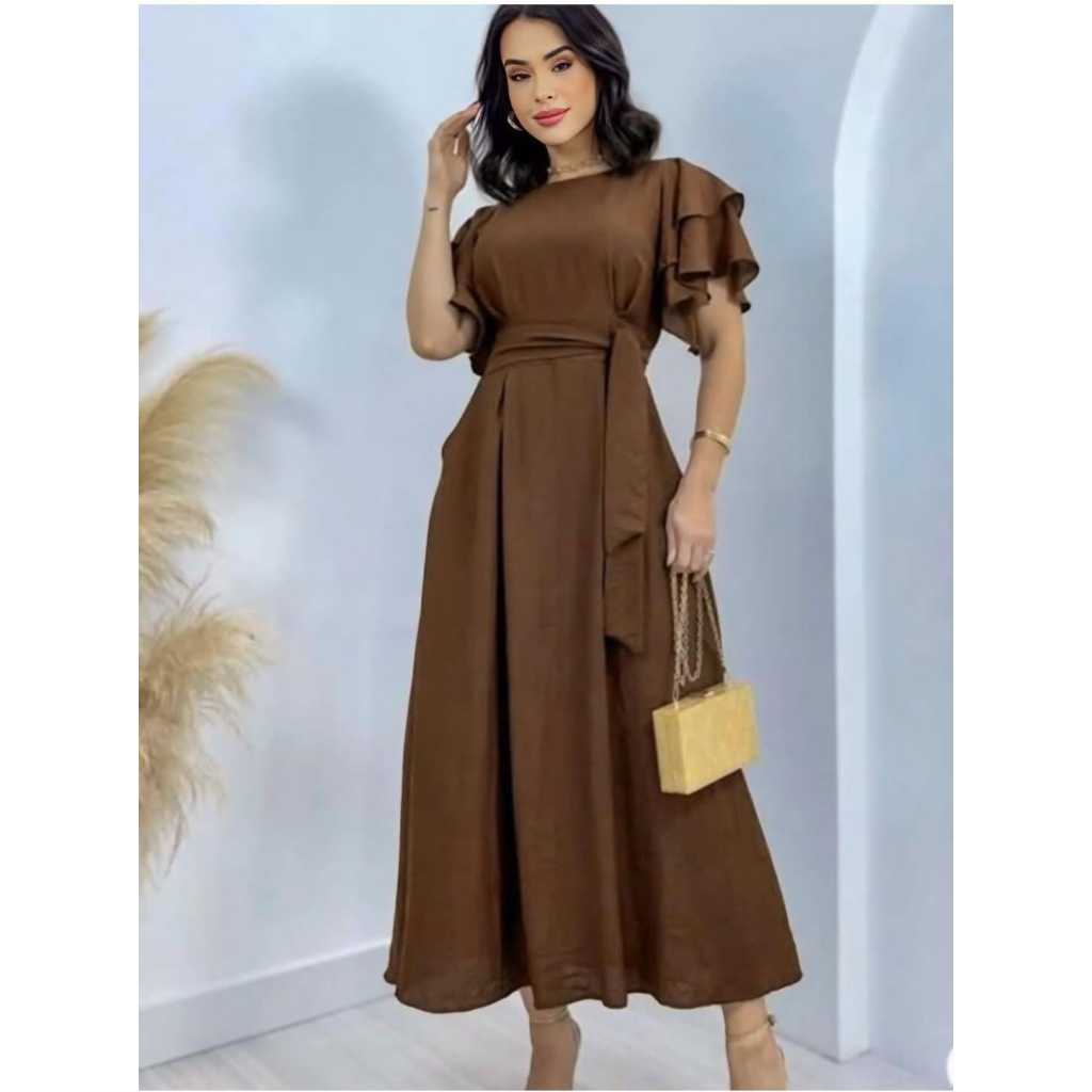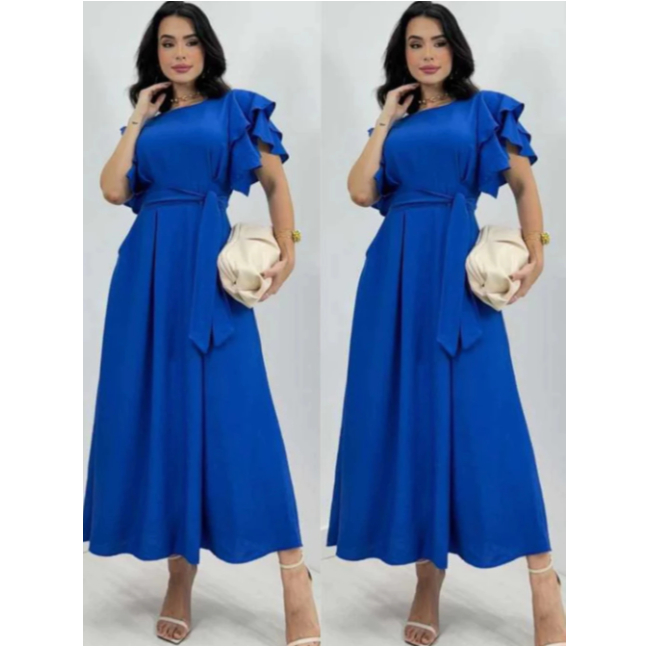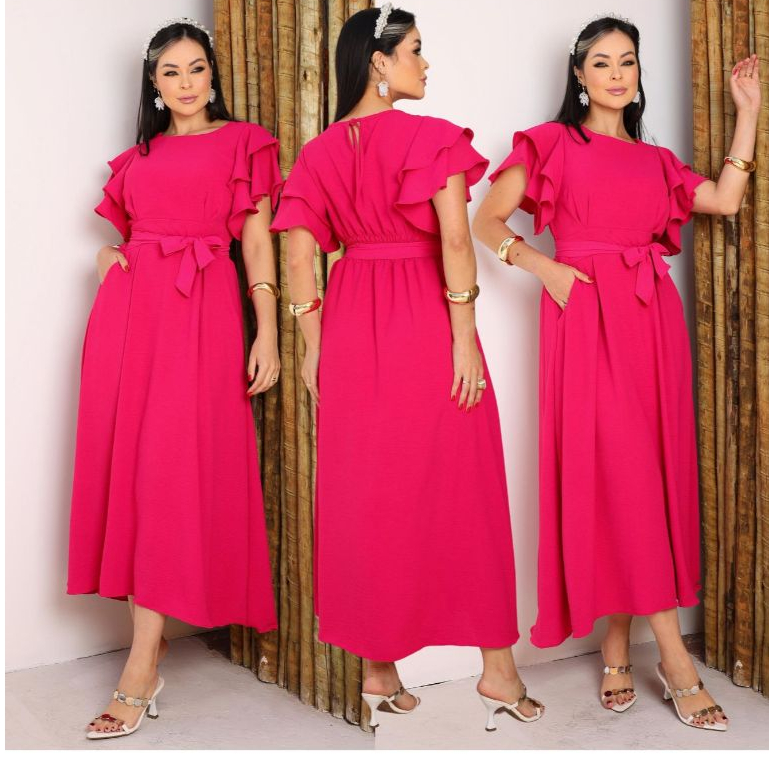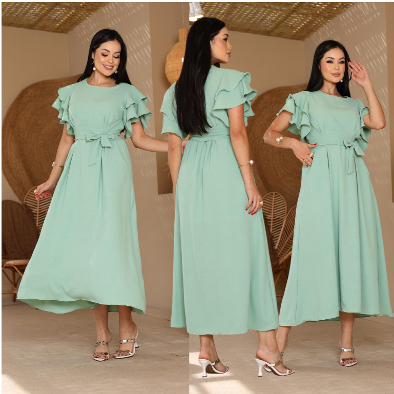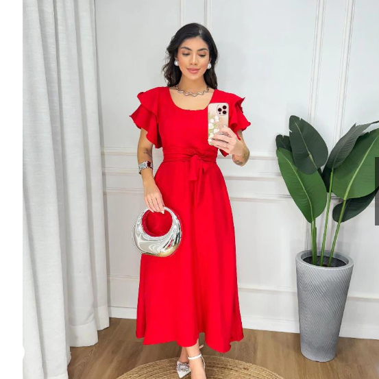 Vestido Feminino Manga Babado Detalhe Lastex na Costa Estilosa e confortável Tecido Duna não Amasa