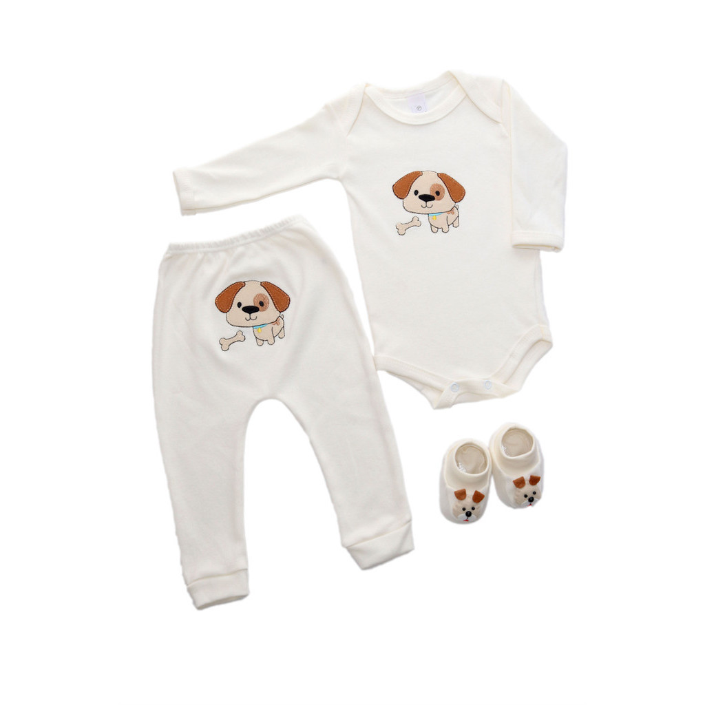 Body Bebê menino Conjunto 3 peças com mijão bordado e sapatinho tema cachorro