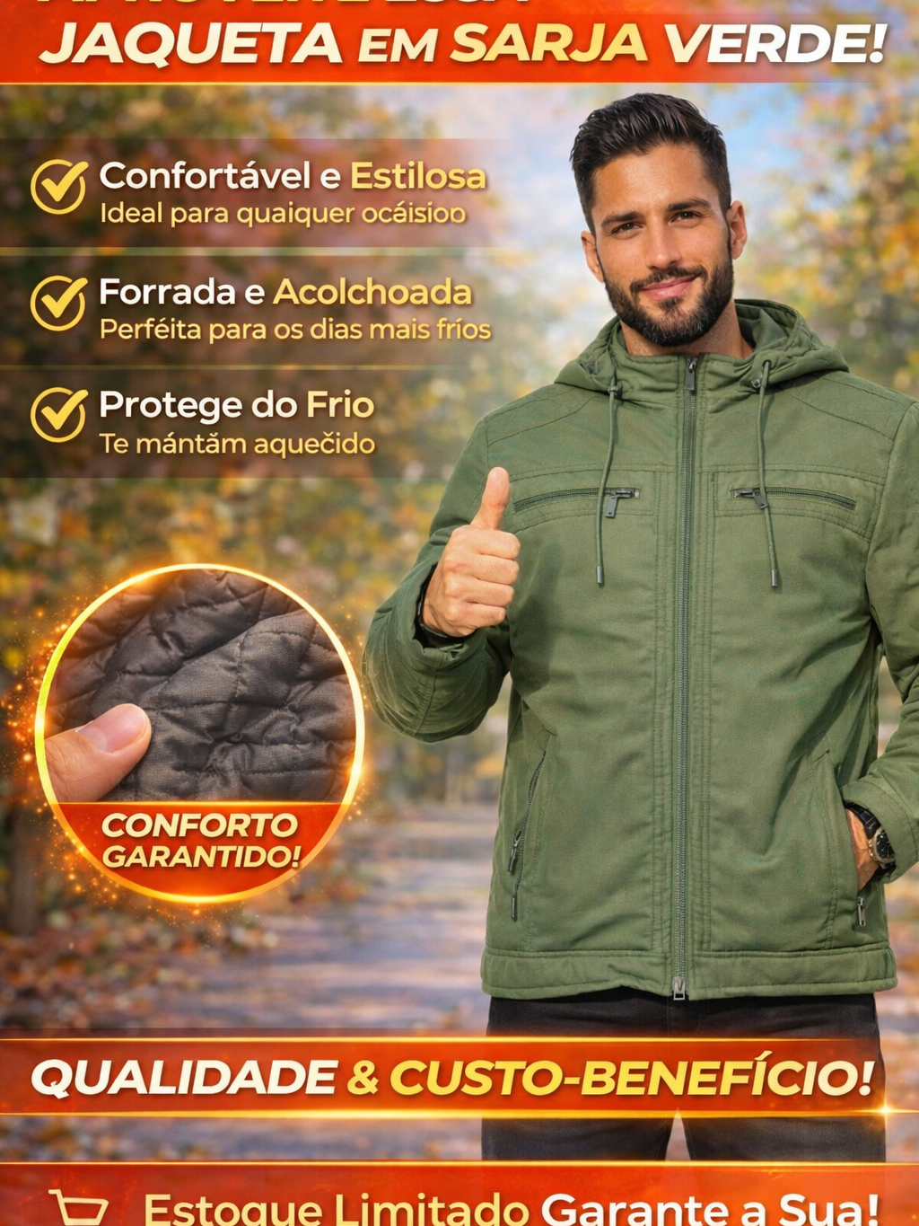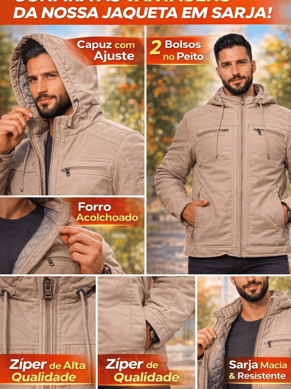 Jaqueta Masculina Sarja Forrada Frio Inverno Sarja Com Pelo Capuz Removível Peluciada Frio Top Inverno Outono