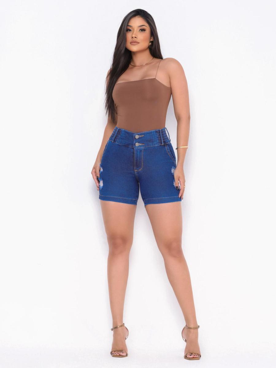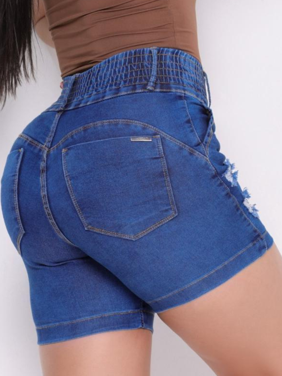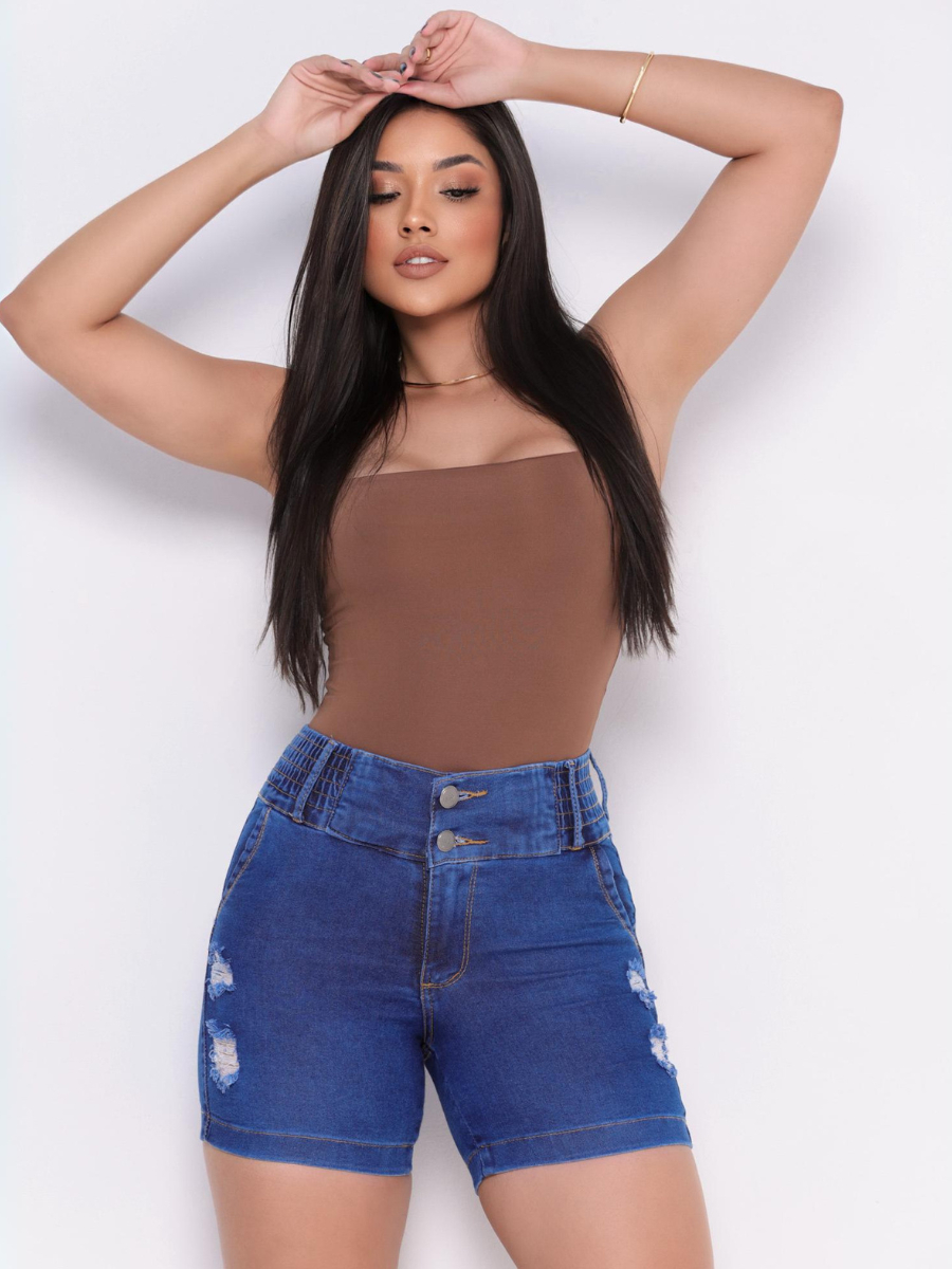Short Feminino Jeans Levanta Bumbum Com Elastano Elástico no Cós Cintura Alta Bermuda Meia Coxa