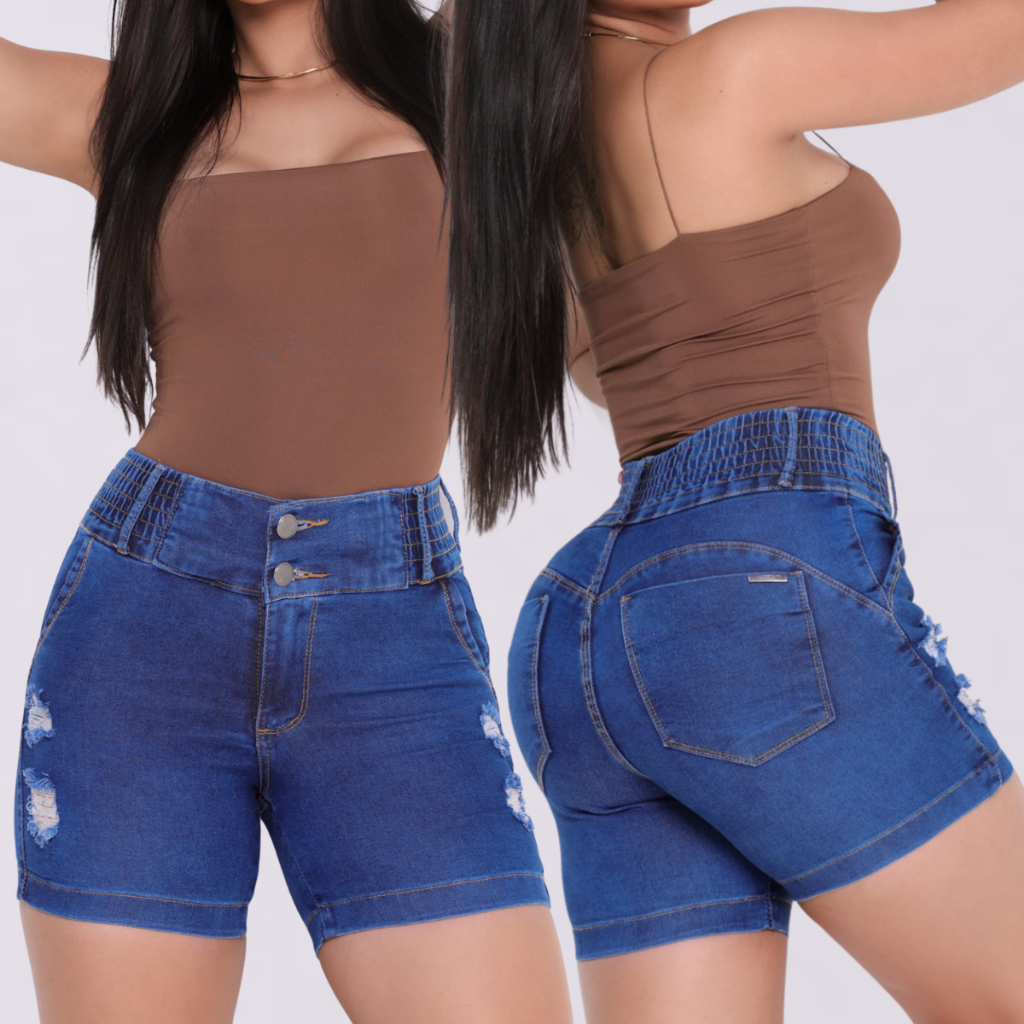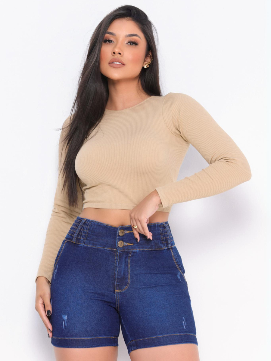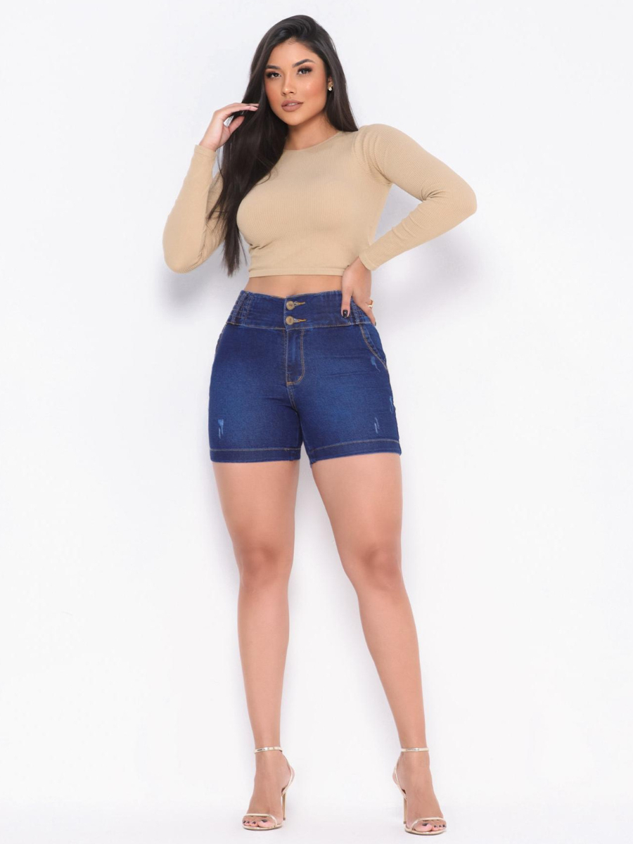 Short Feminino Jeans Levanta Bumbum Com Elastano Elástico no Cós Cintura Alta Bermuda Meia Coxa