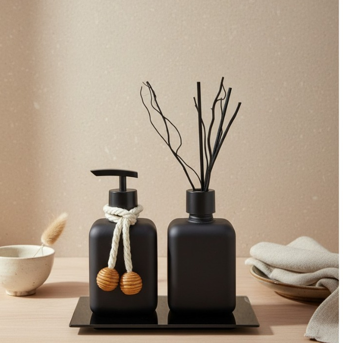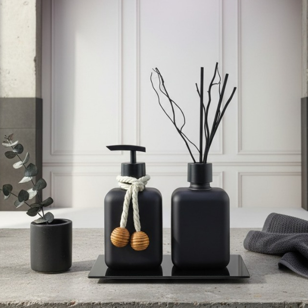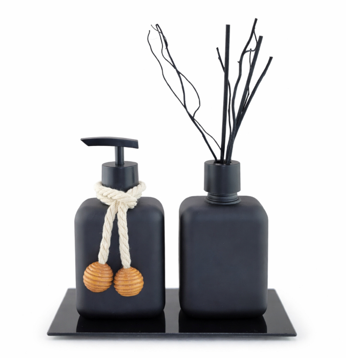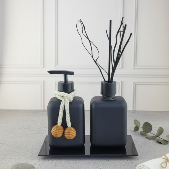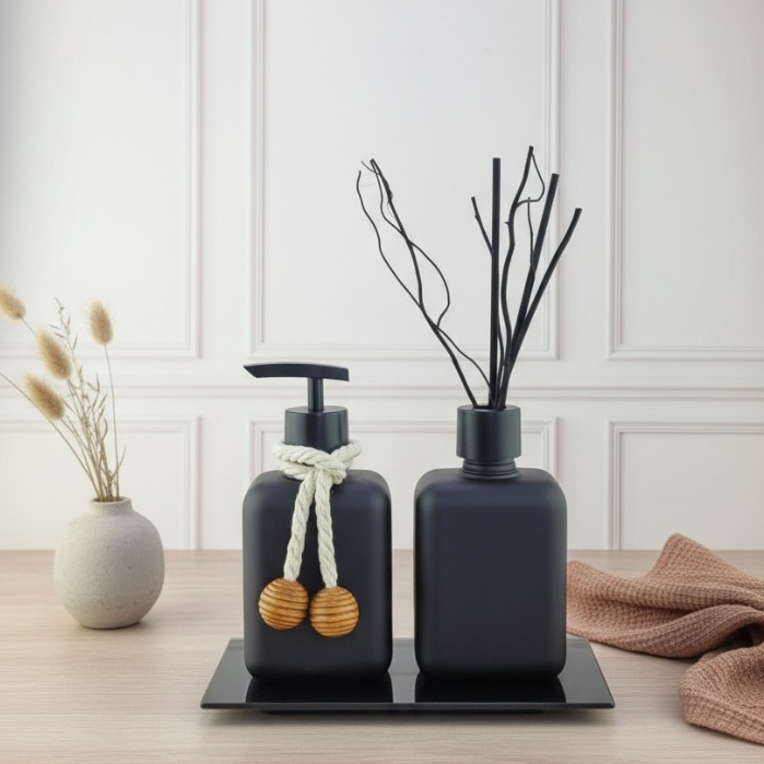 Kit Lavabo Banheiro Preto Fosco Luxo 260ml Vidro Difusor Saboneteira Bandeja Vidro Decorativo Casa