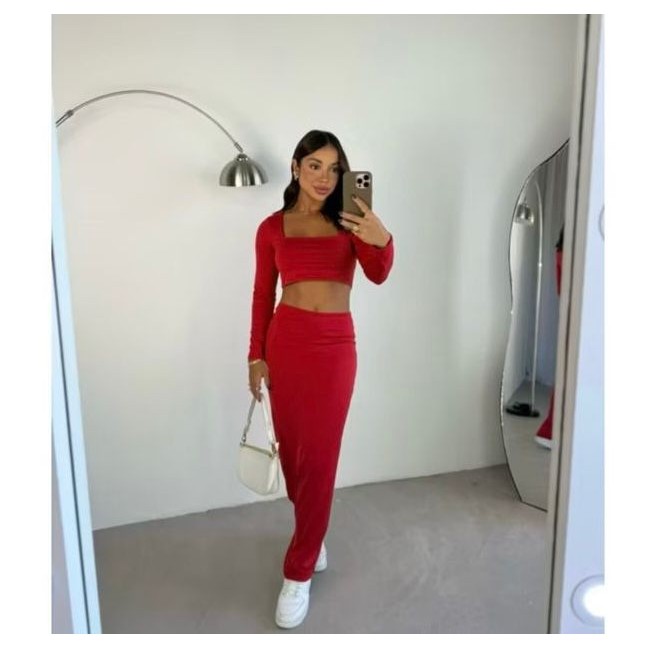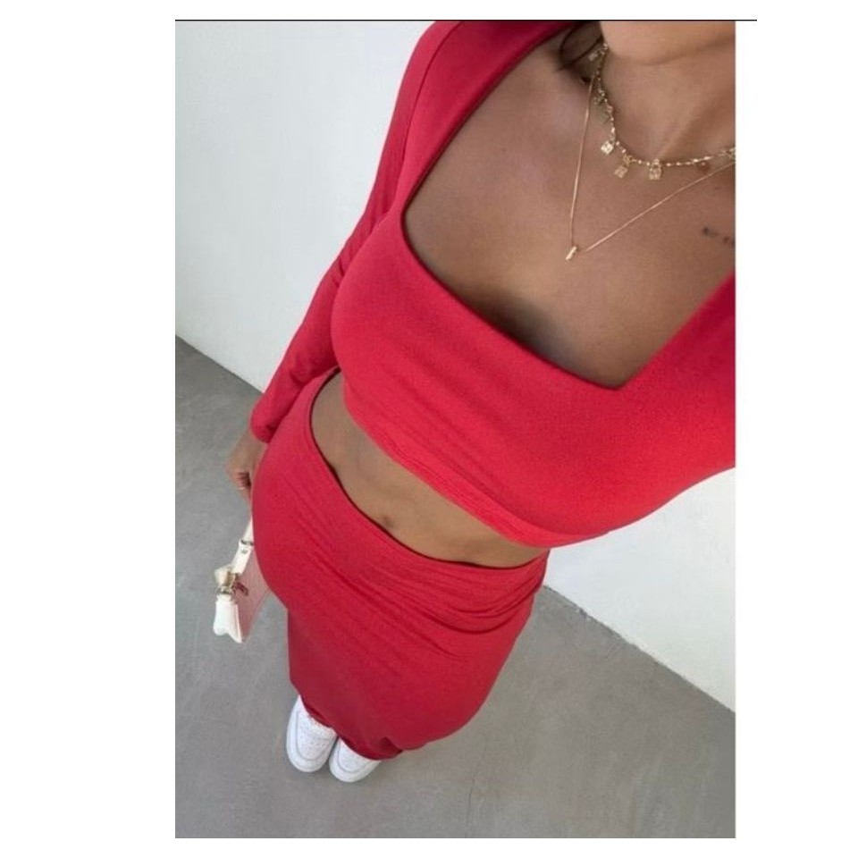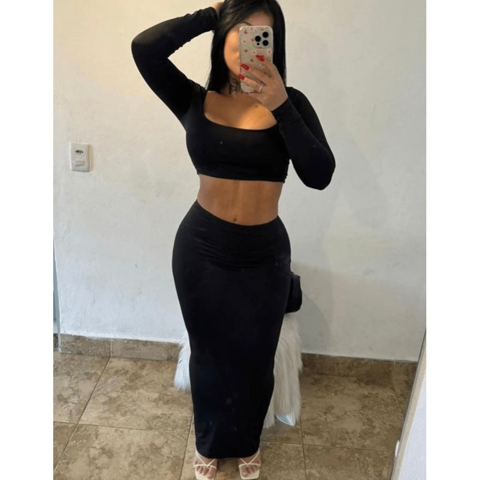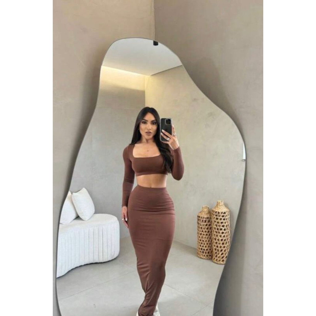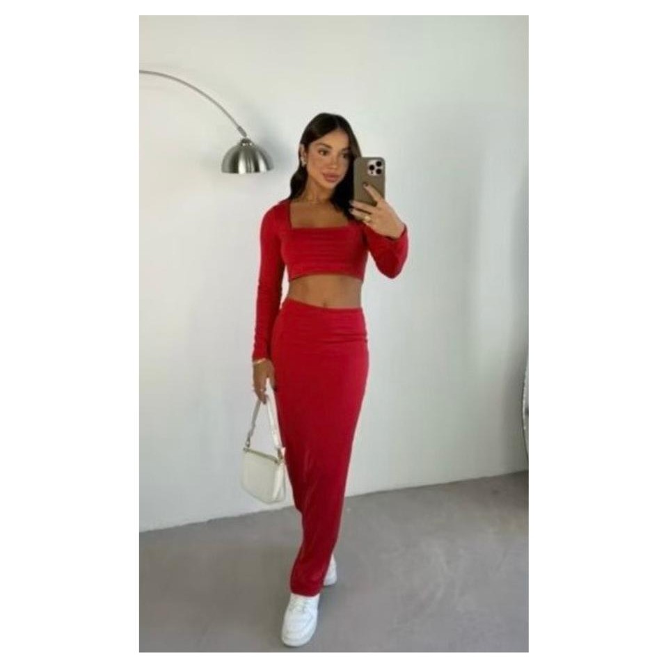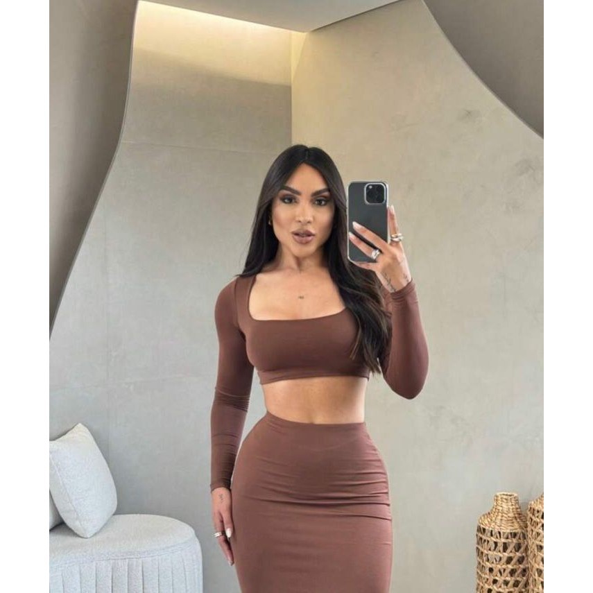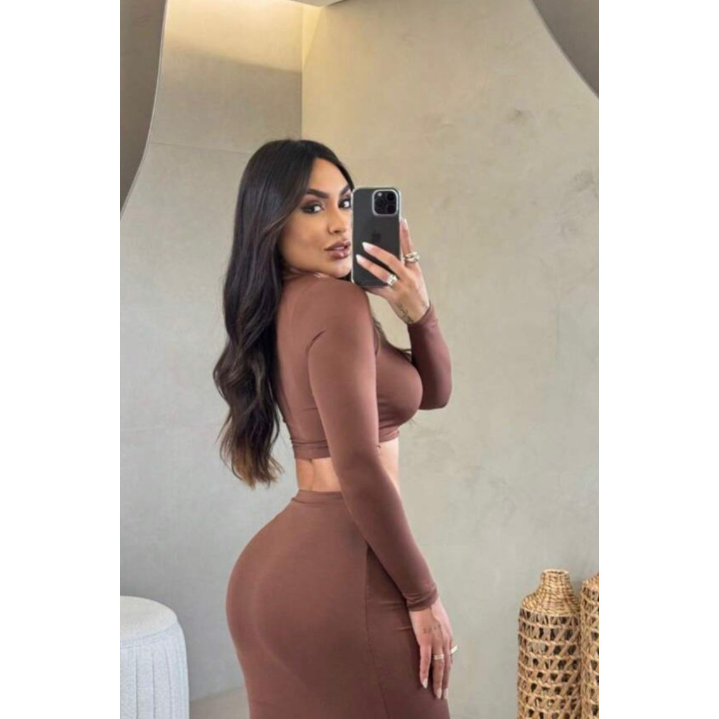 CONJUNTO GRINGA CROPPED MANGA LONGA E SAIA MIDI TUBINHO OUTONO INVERNO FESTA BADALADA SENSUAL