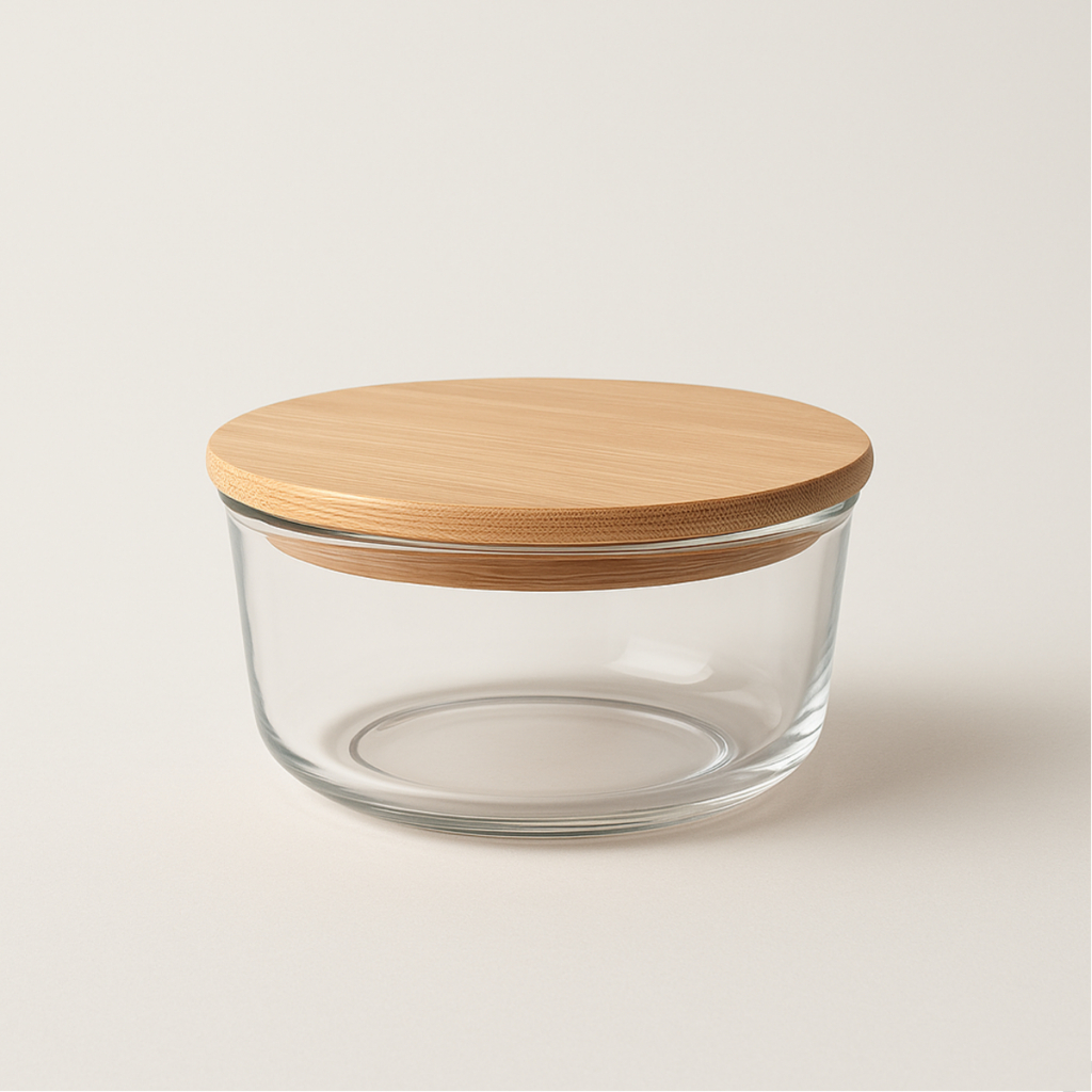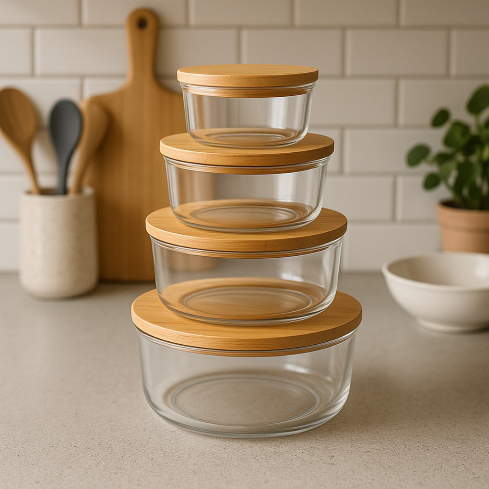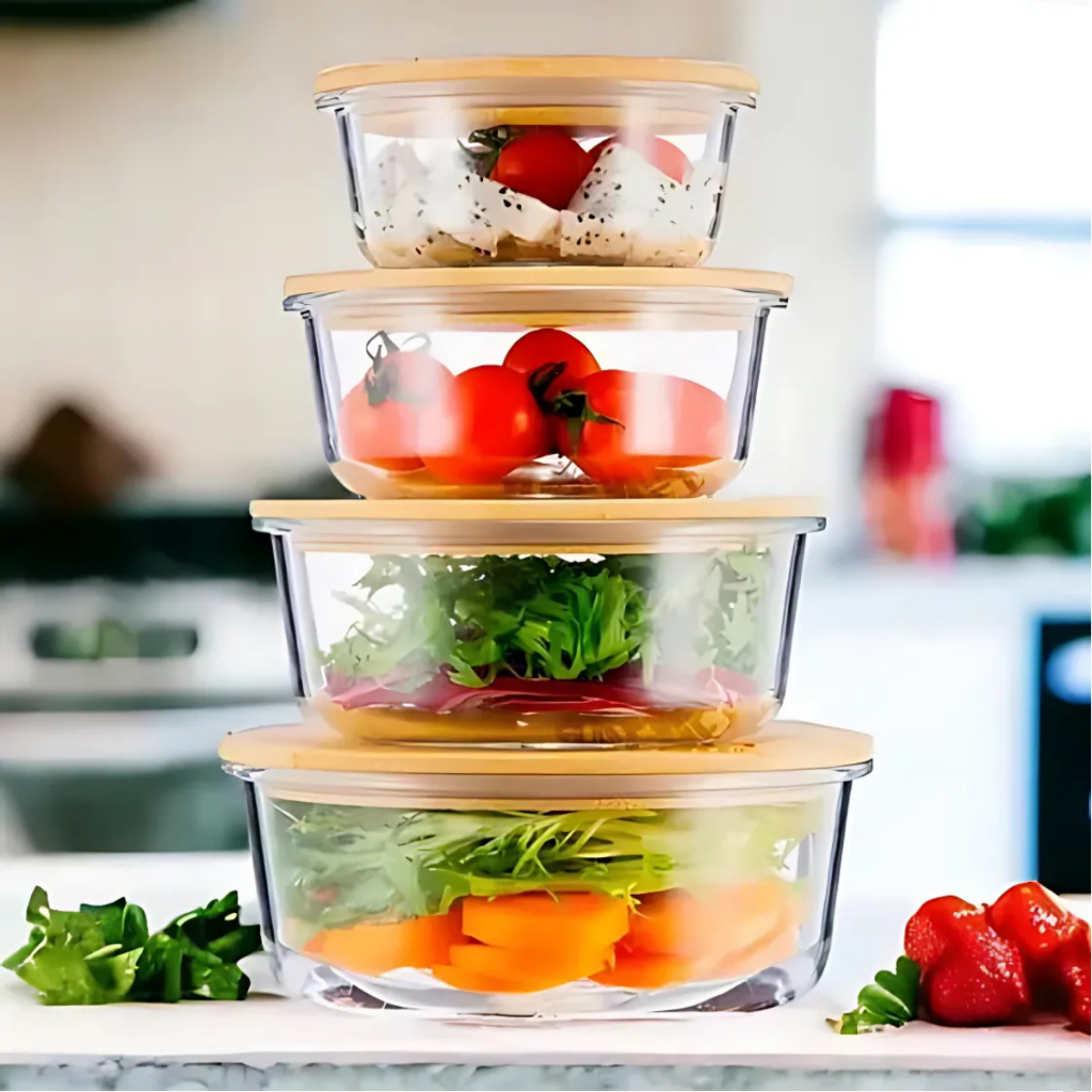 Kit 4 Pote Hermetico De Vidro Tampa De Bambu Tigela Marmita Salada Jogo De Potes De Mantimentos