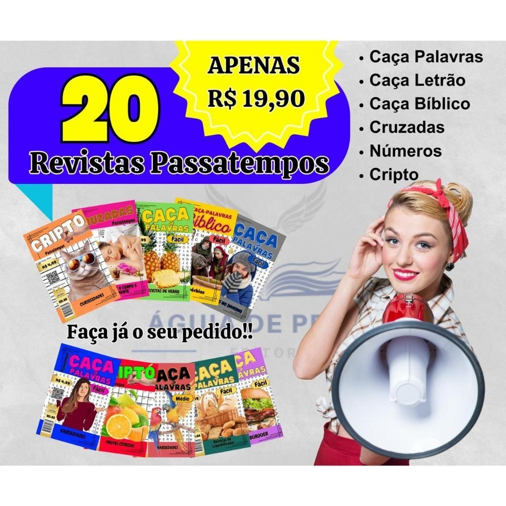 Kit com 20 Passatempo sem repetição. Incluindo caça letrão, caça palavra, cruzada e cripto