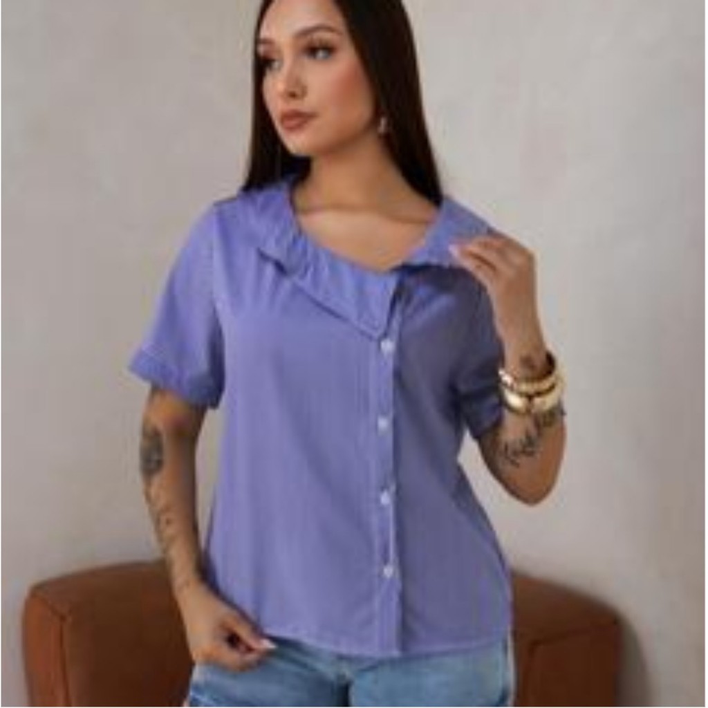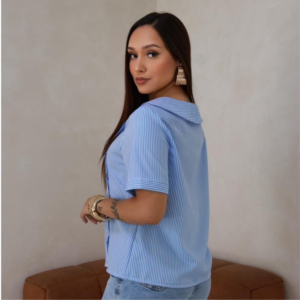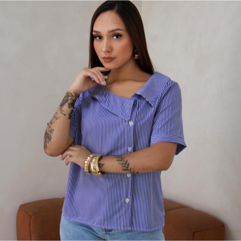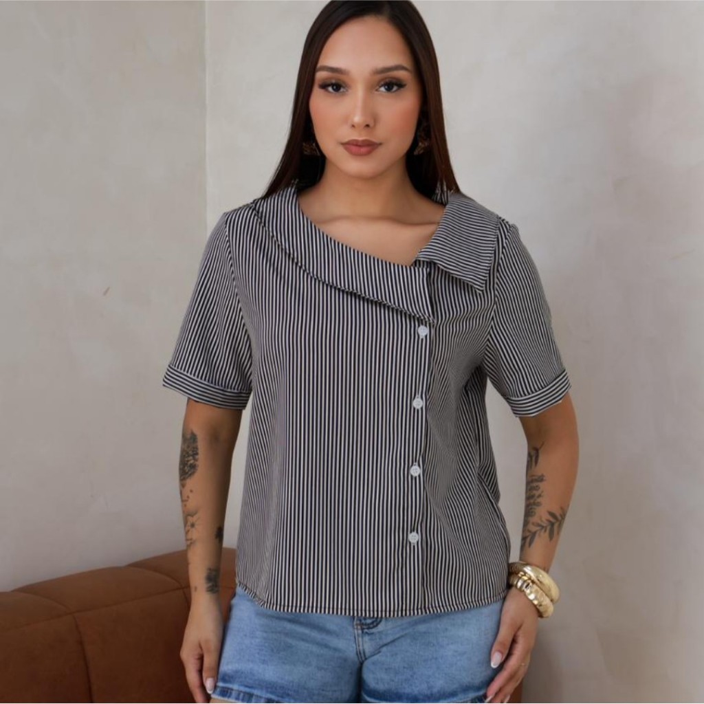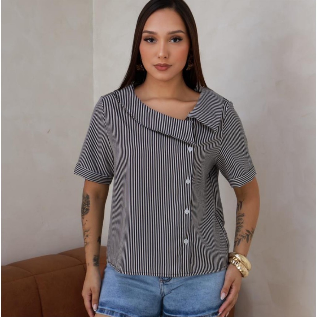 5 CAMISA FEMININA GOLA ASSIMETRICA LISTRADA MANGA CURTA