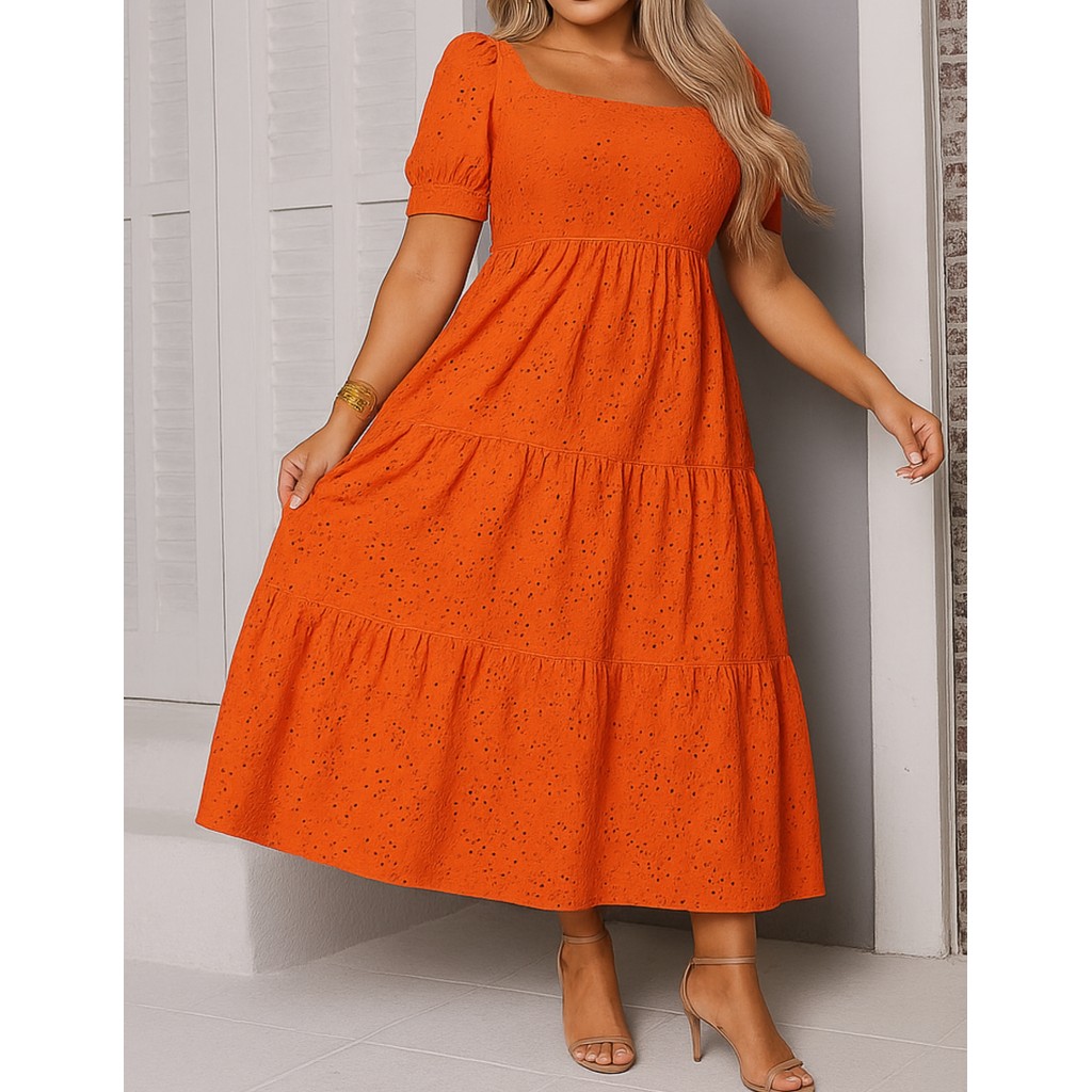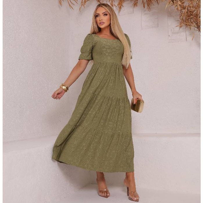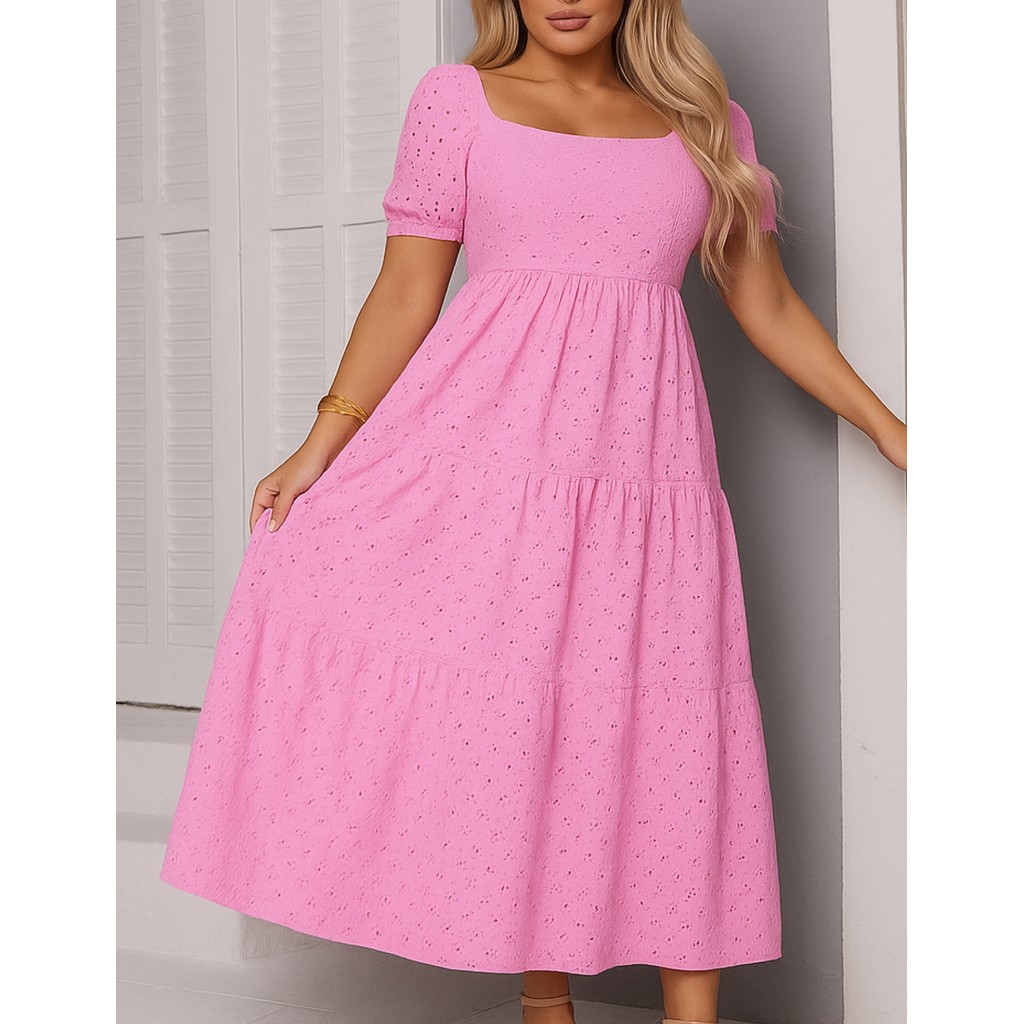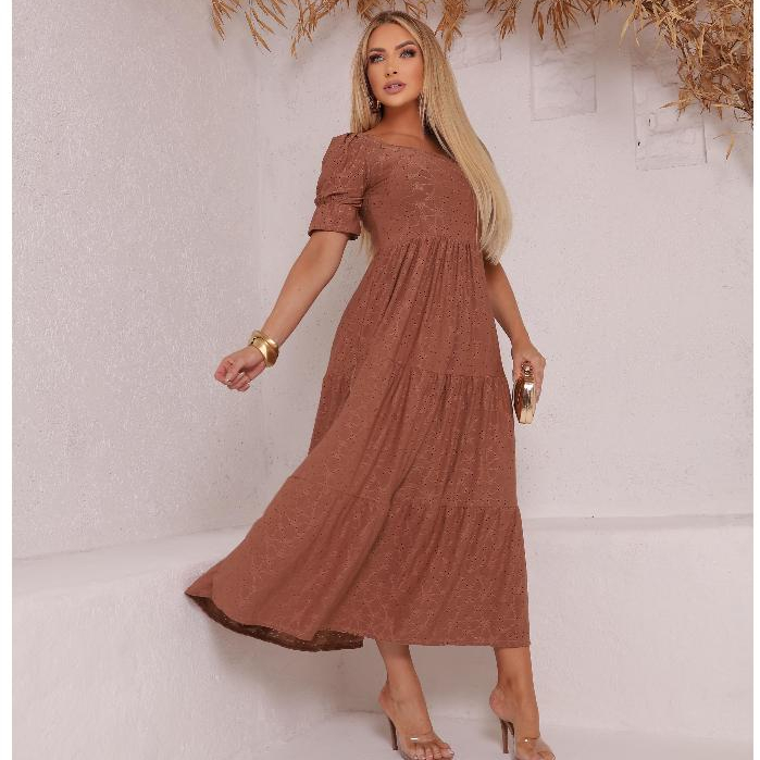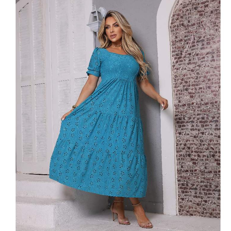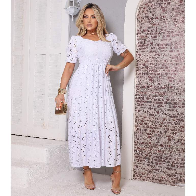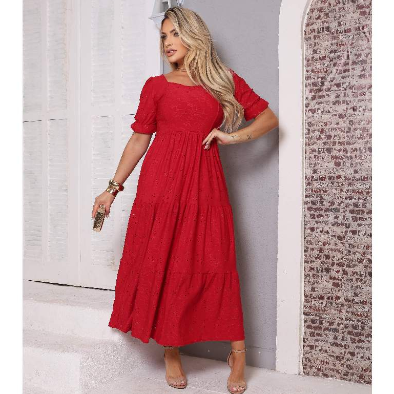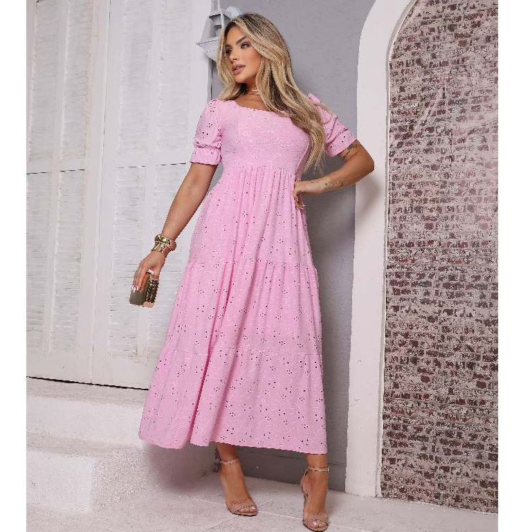 Vestido Longo Três Marias Feminino Malha Laise Midi Manga Bufante Forro no Busto e Saia, Cores Candy