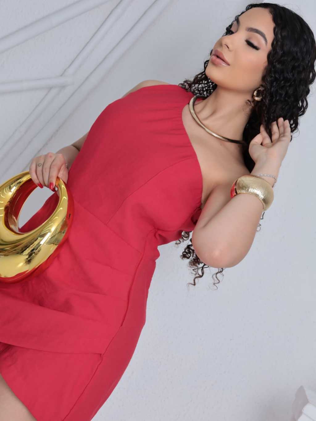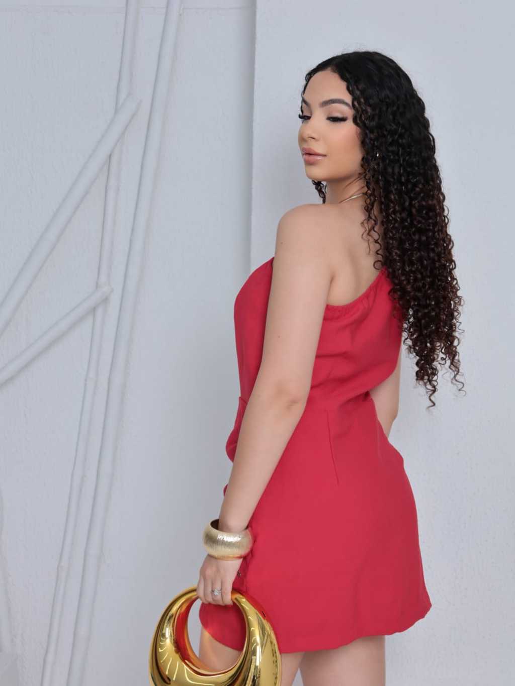 Macacão com elástico na parte de cima é assimétrico embaixo é short mas saia abaxio