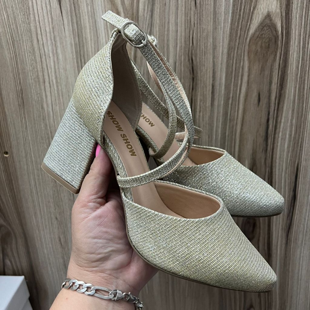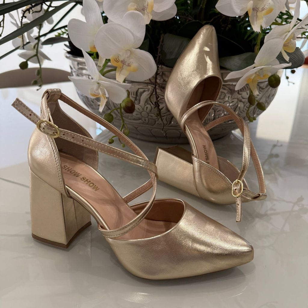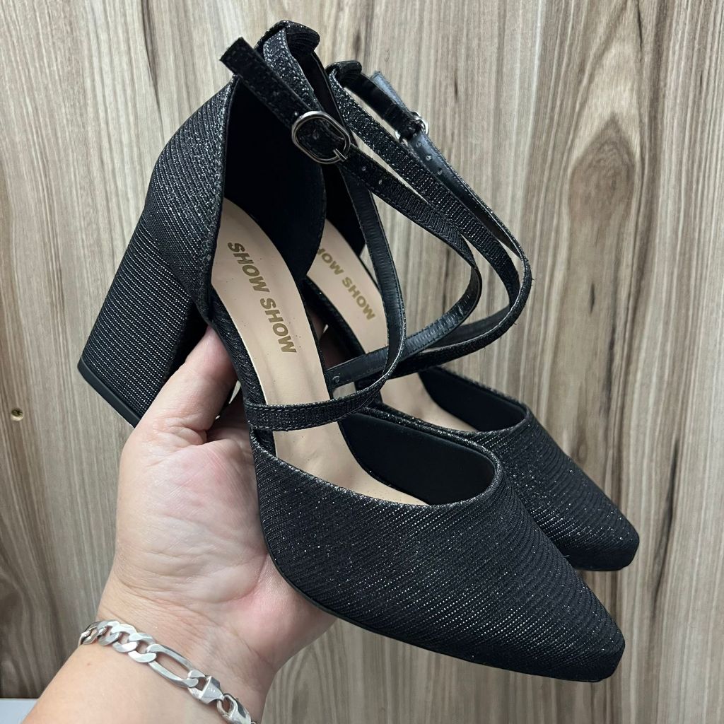 Sapato Feminino Scarpin Tiras Cruzadas Salto Alto 8 cm Grosso brilho elegante Original Show Show