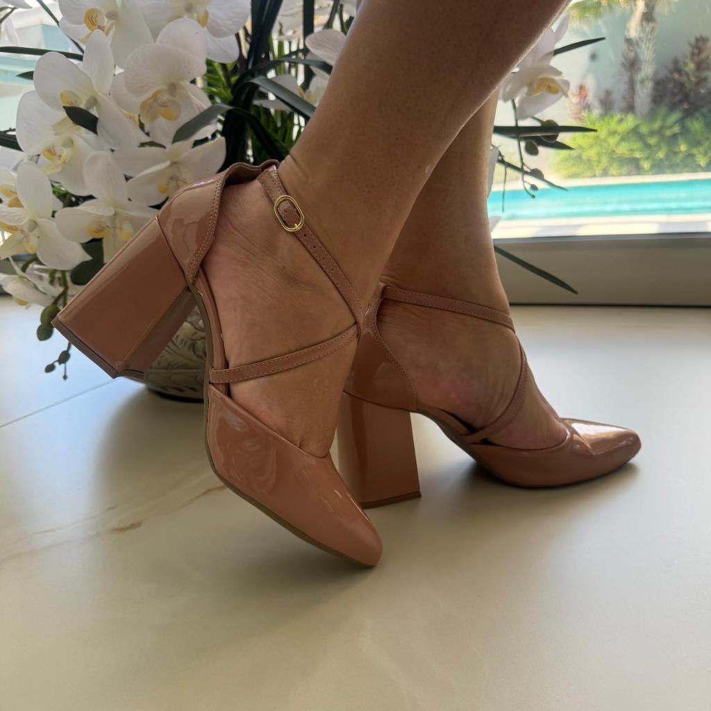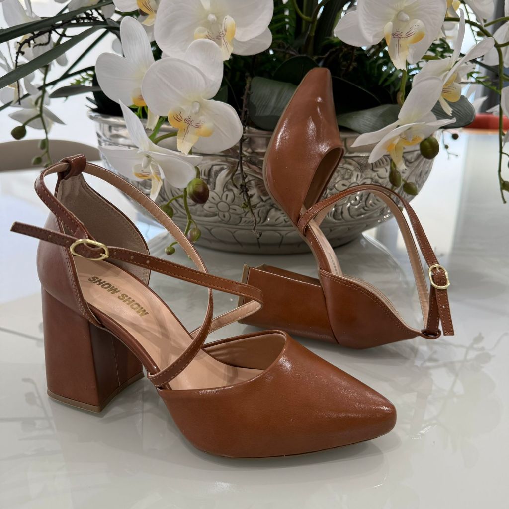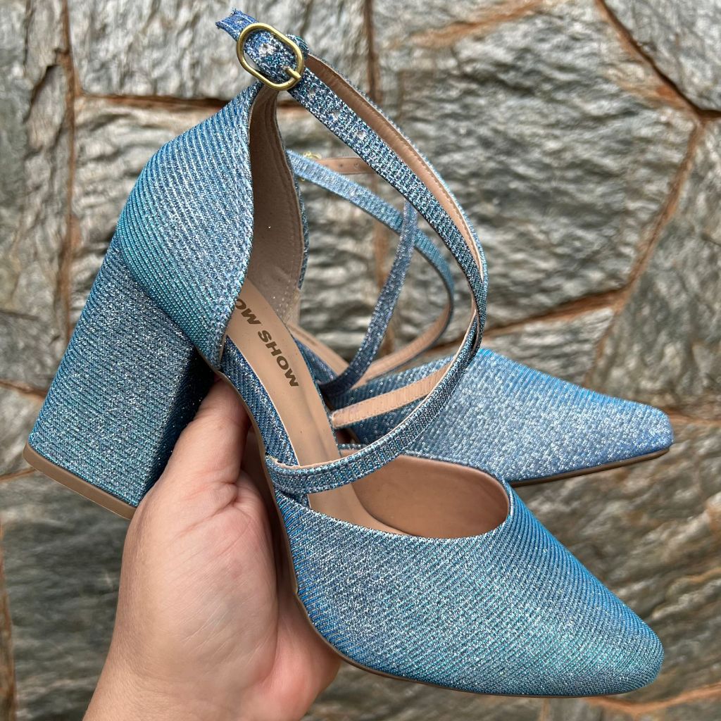 Sapato Feminino Scarpin Tiras Cruzadas Salto Alto 8 cm Grosso brilho elegante Original Show Show
