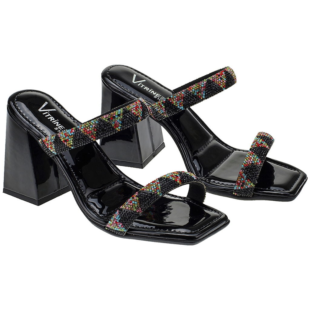Tamanco Feminino Salto Alto Verniz com Tira Strass Colorido Acolchoado