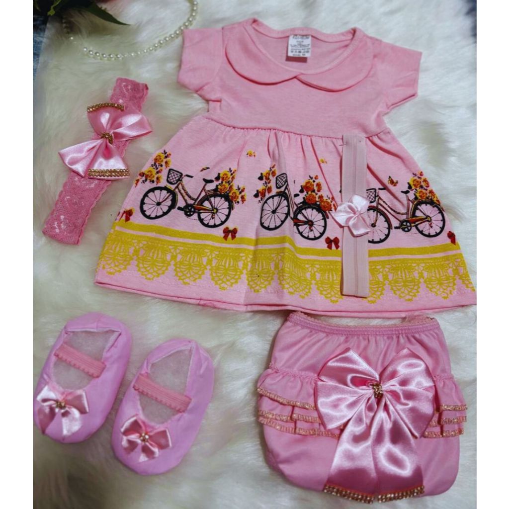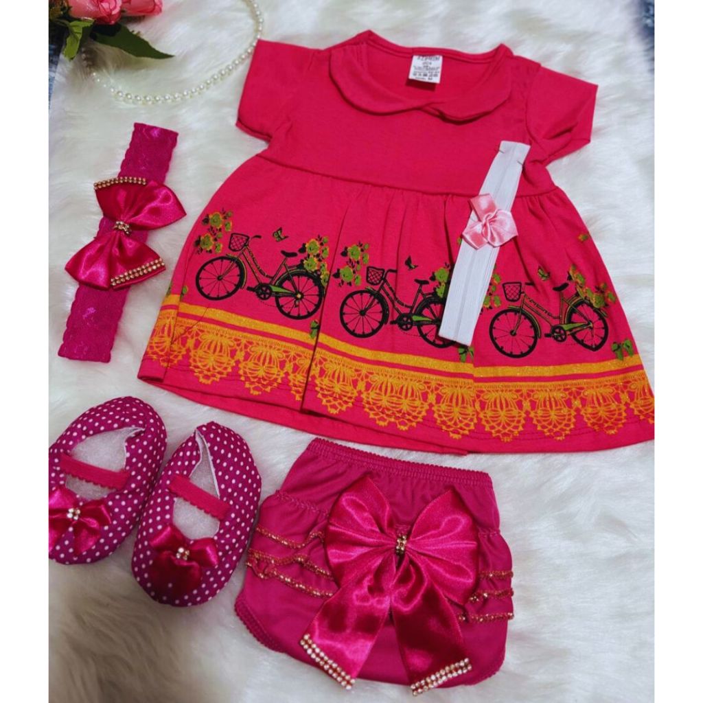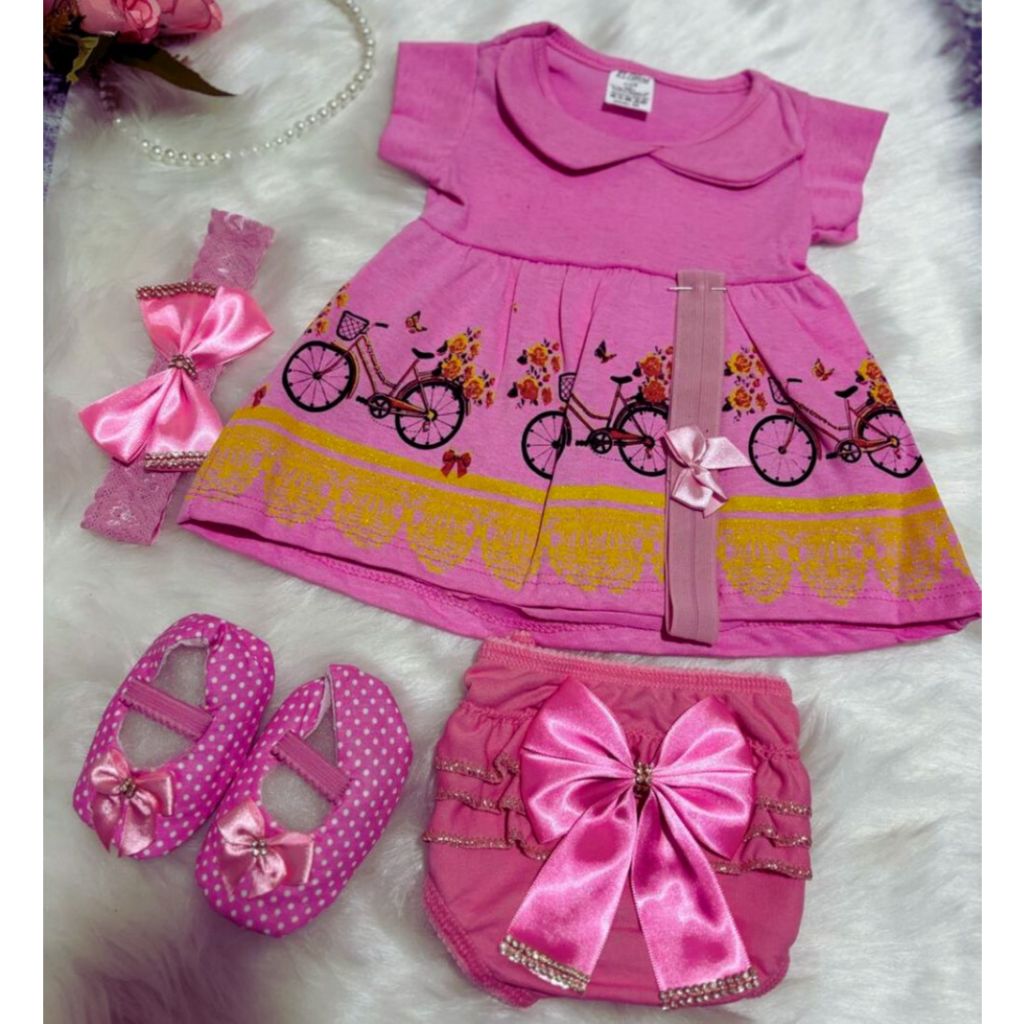Kit Vestido temático recém nascido 5 Peças para Bebê com sapatinho e calcinha bunda rica