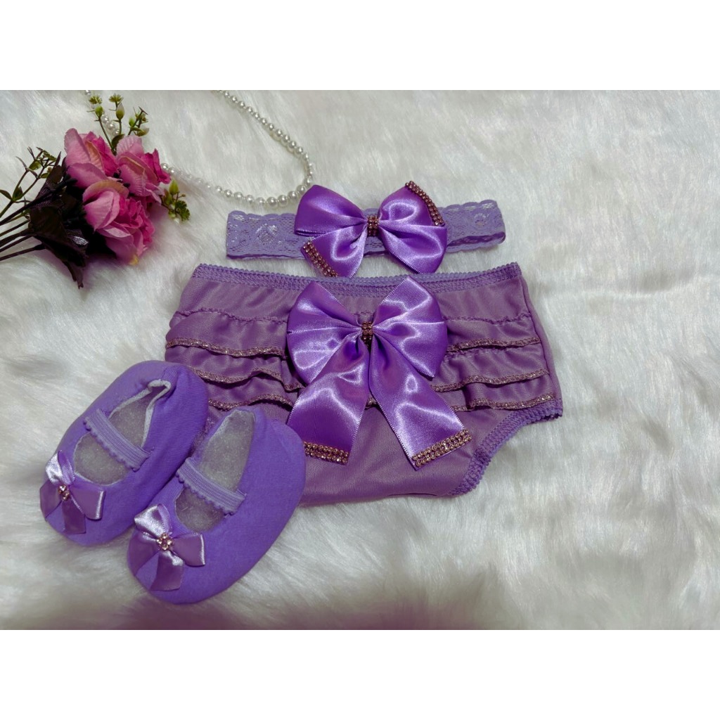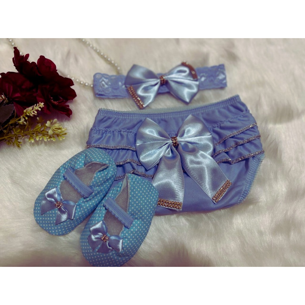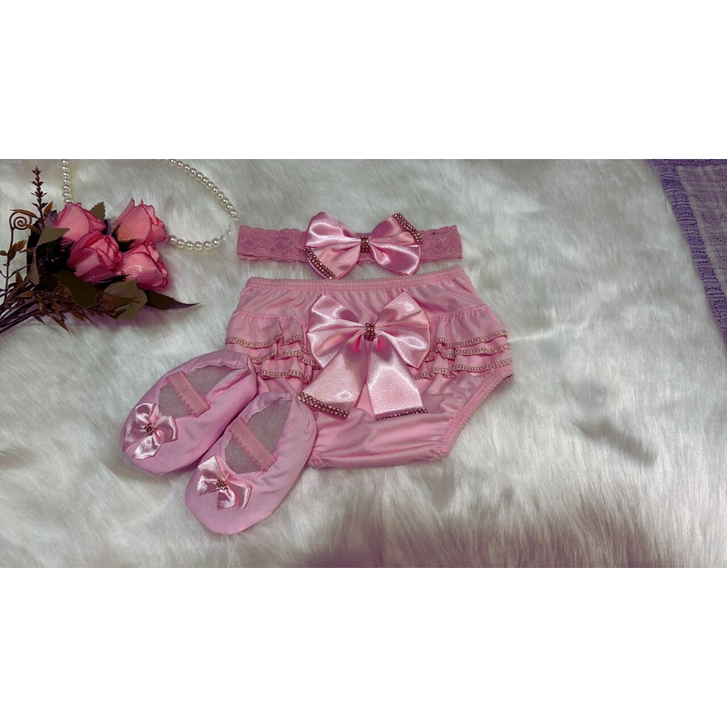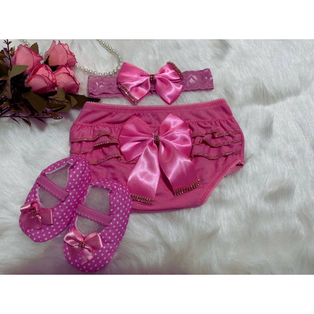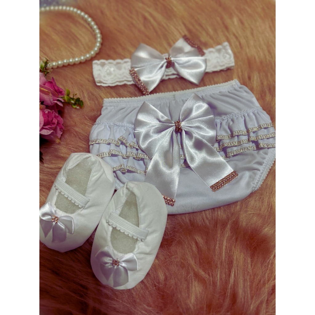 Kit Bebê 0 a 6 Meses – Calcinha Bunda Rica + Sapatinho + Tiara | Luxo e Conforto