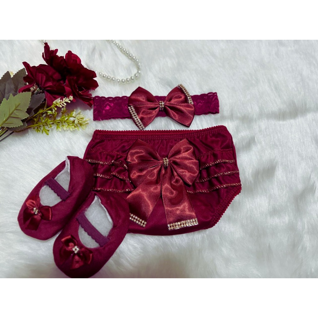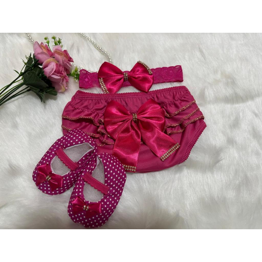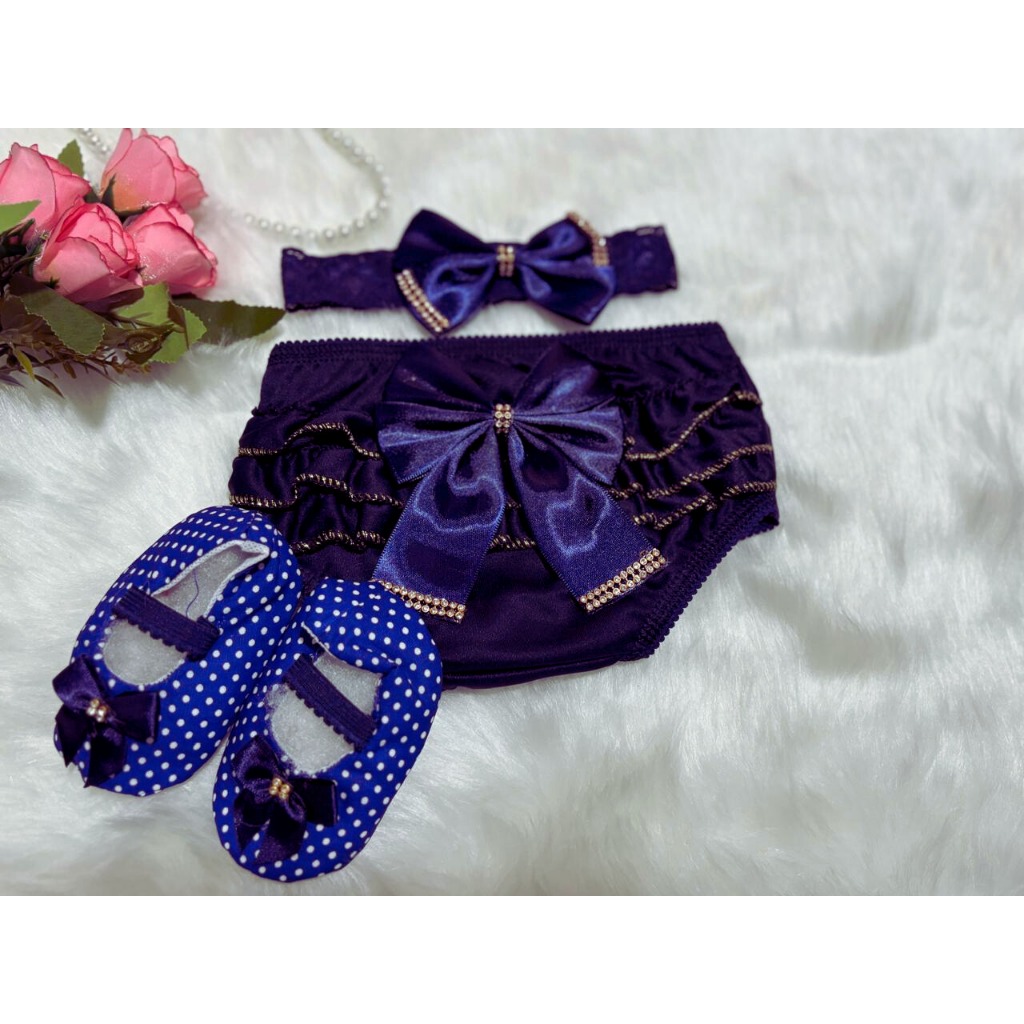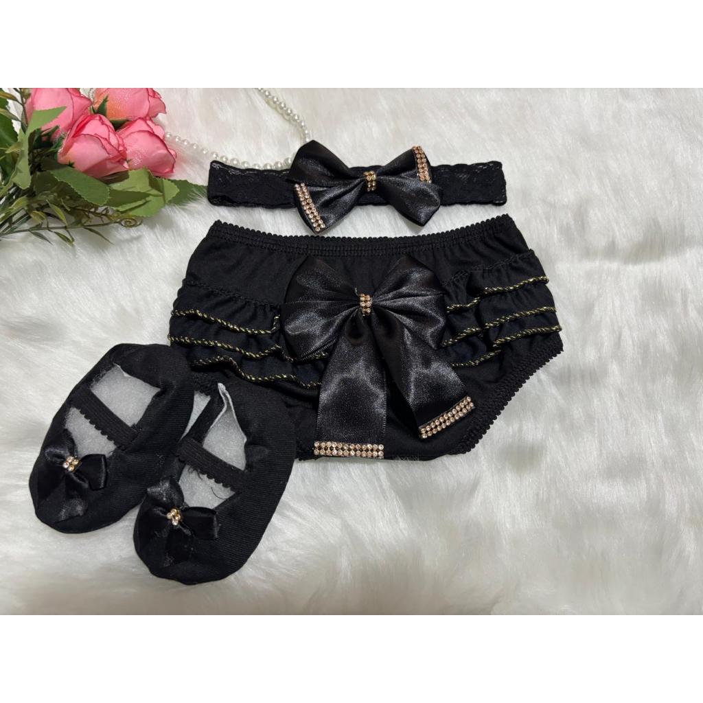 Kit Bebê 0 a 6 Meses – Calcinha Bunda Rica + Sapatinho + Tiara | Luxo e Conforto