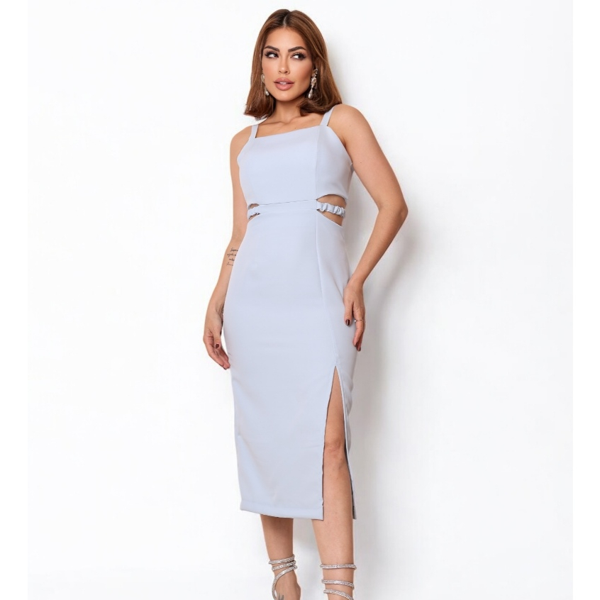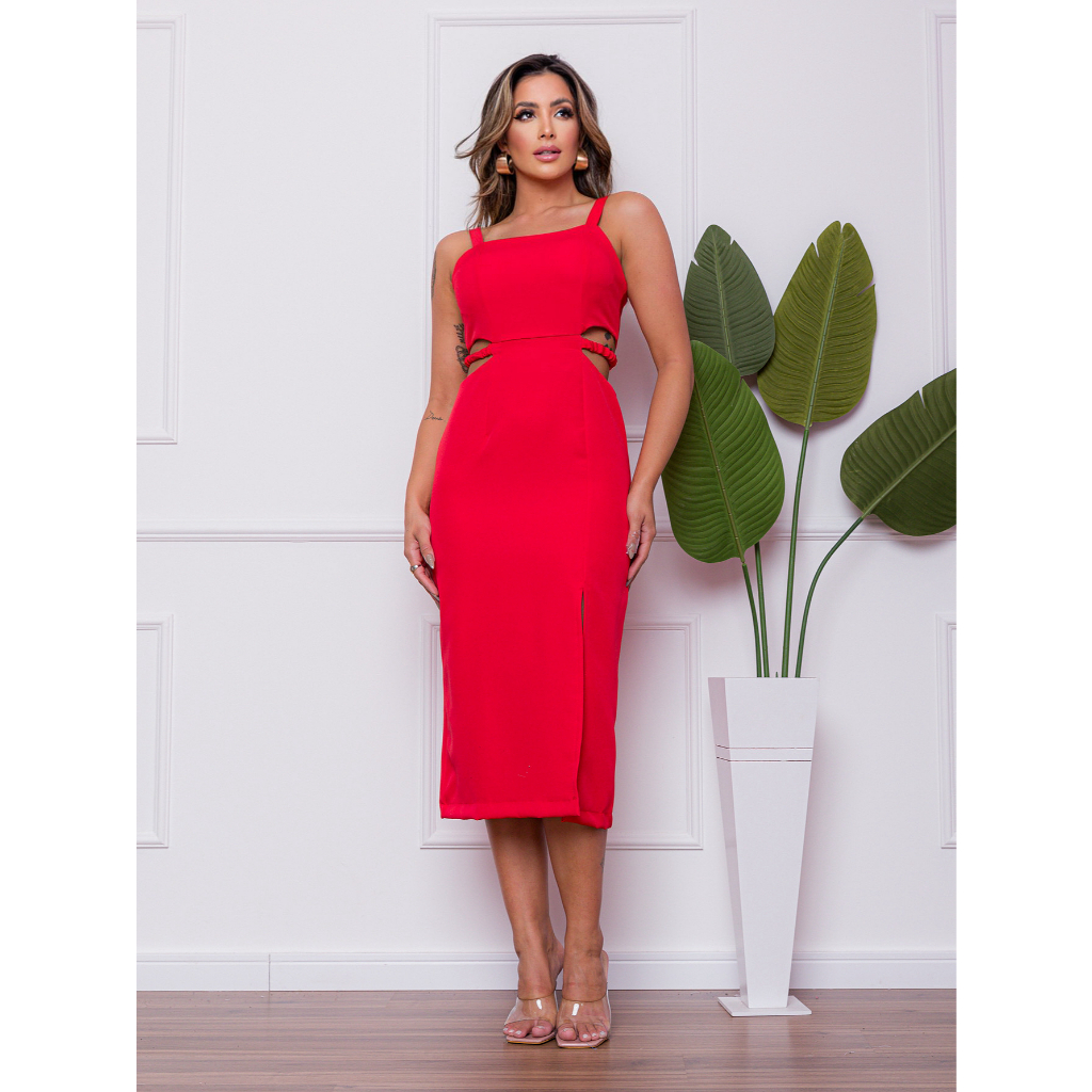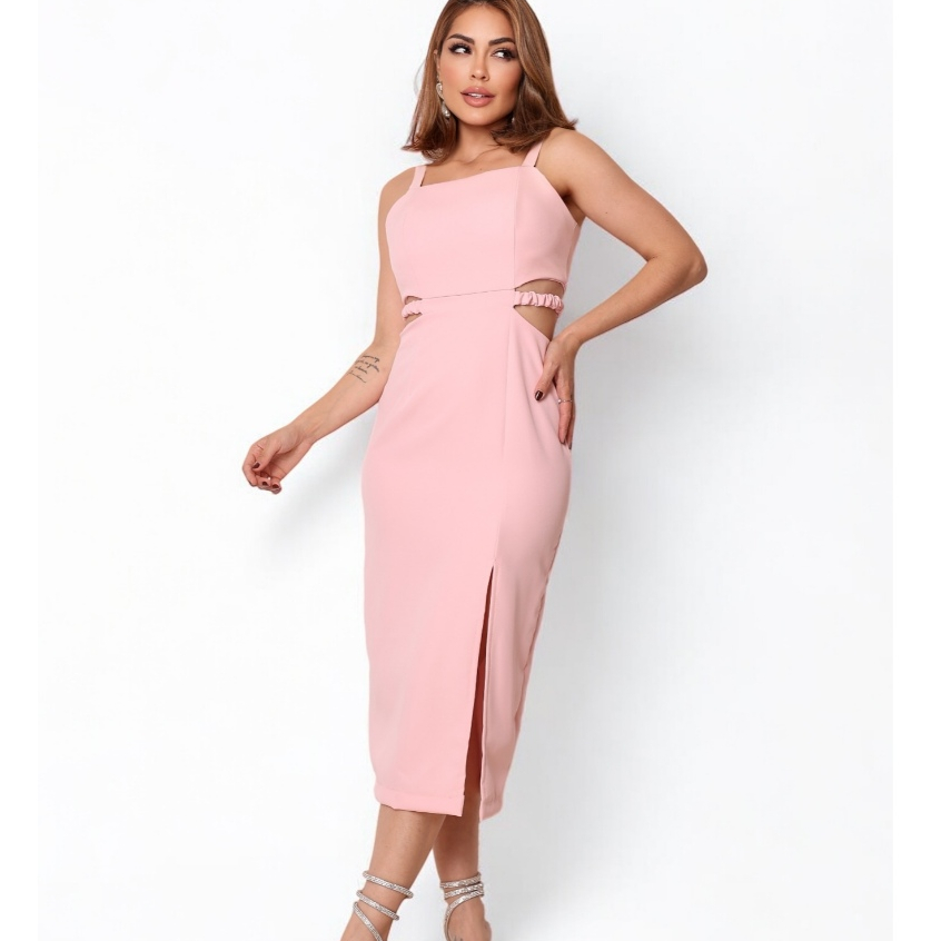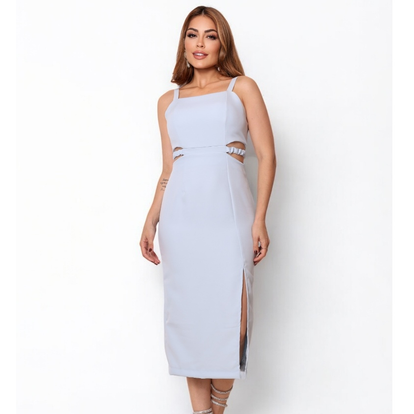 Vestido Midi Design Cut-Out Detalhe de Franzido na Cintura e Fenda Elegante Moda COD 268