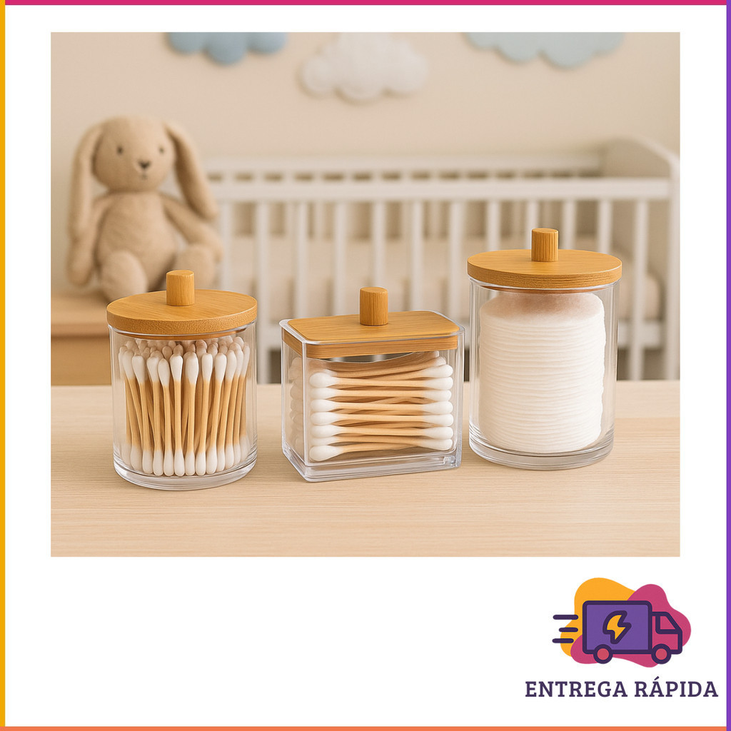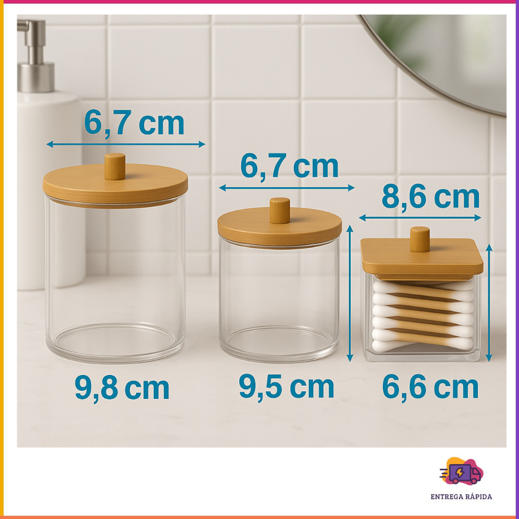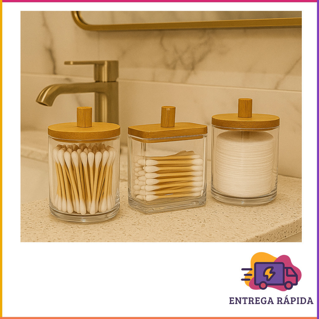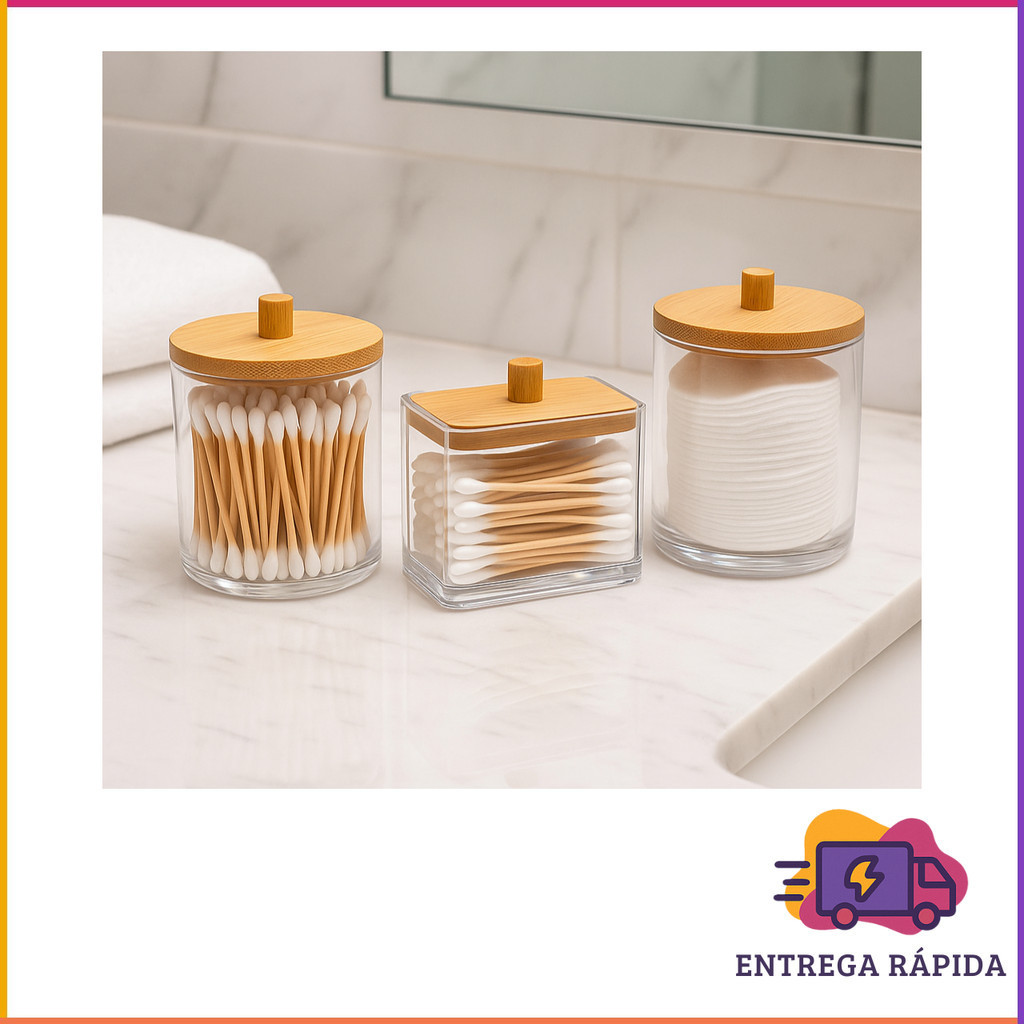 Kit 3 Organizadores de Banheiro com Tampa de Bambu – Multiuso, Hastes e Algodão