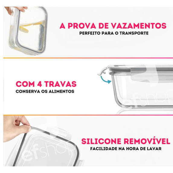 Kit 5 Potes 1040 ml de Vidro Tampa com Trava Hermético Respiro Marmita Transparente Freezer Forno Micro-ondas