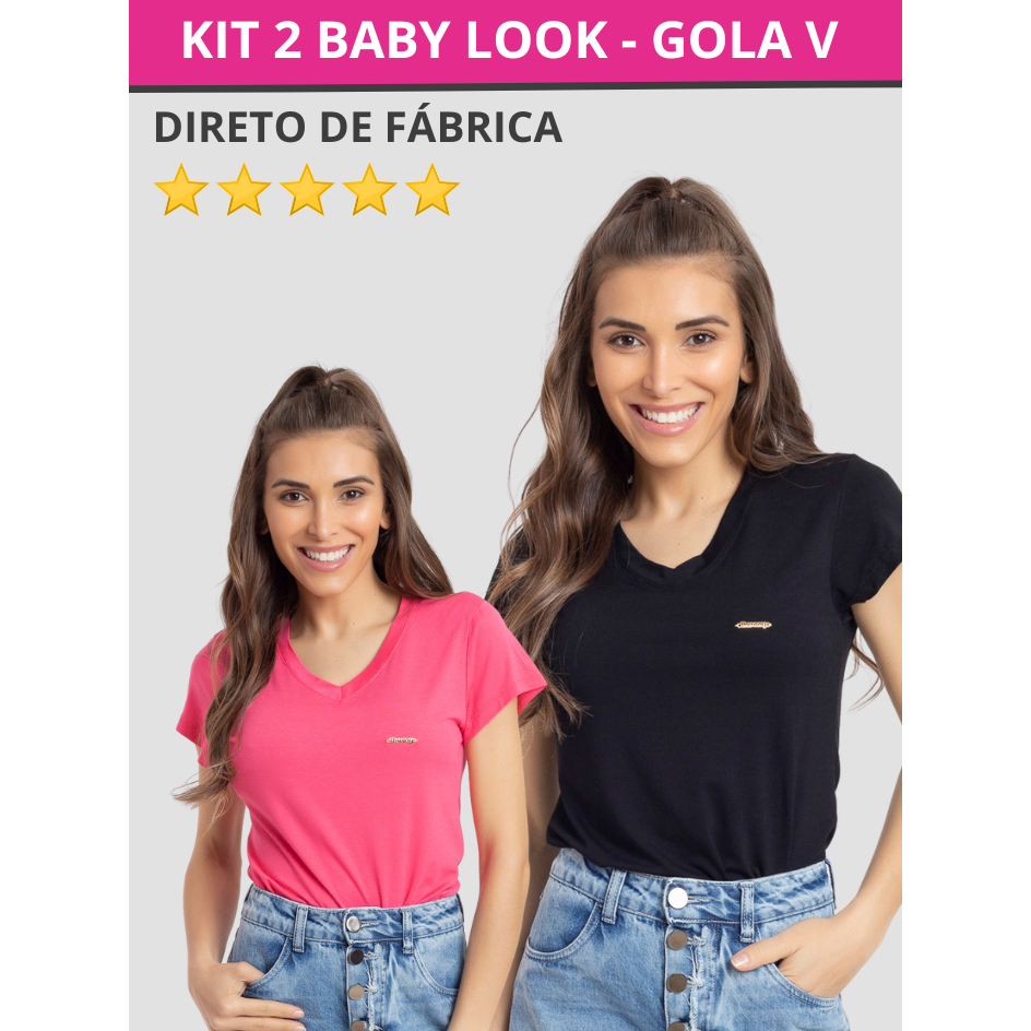 Kit 2 Camisas Blusas Baby Look Femininas Gola V Manga Curta