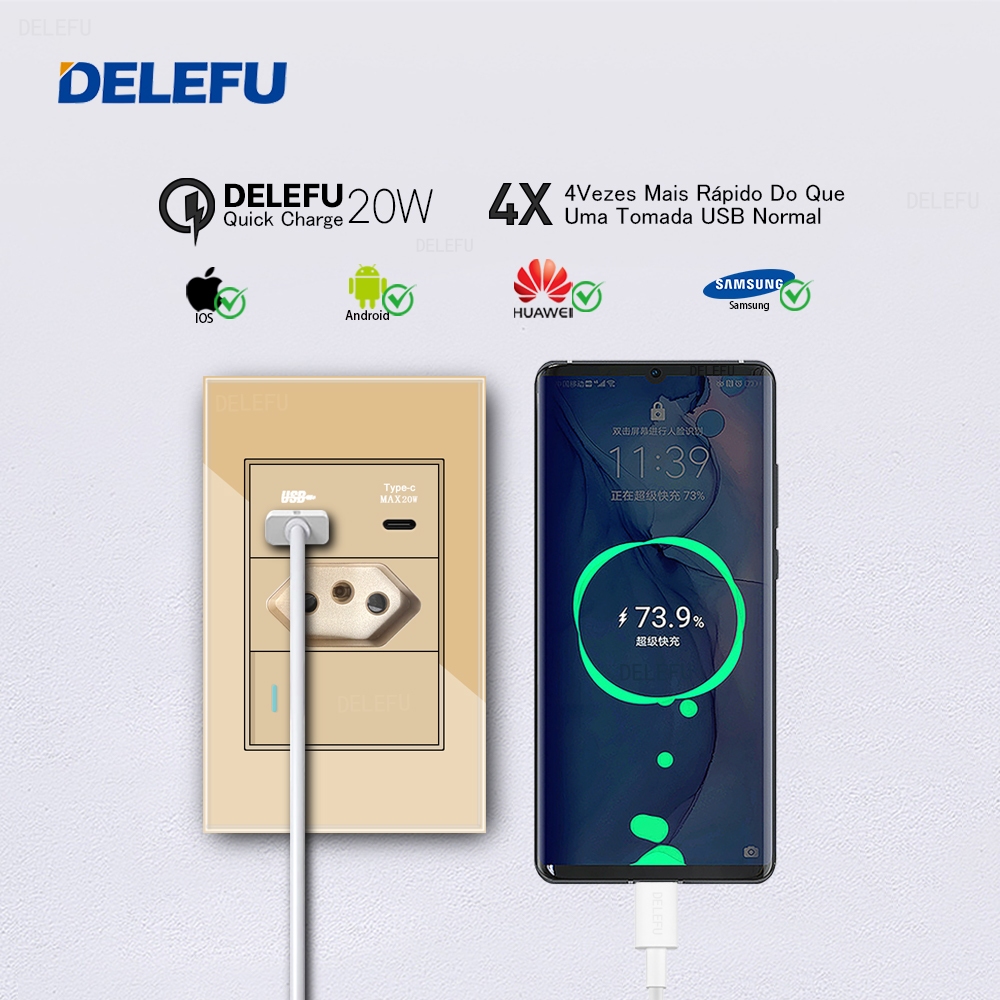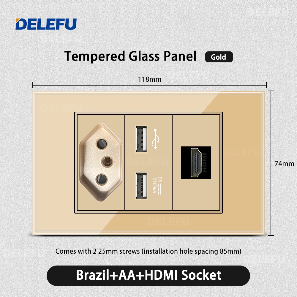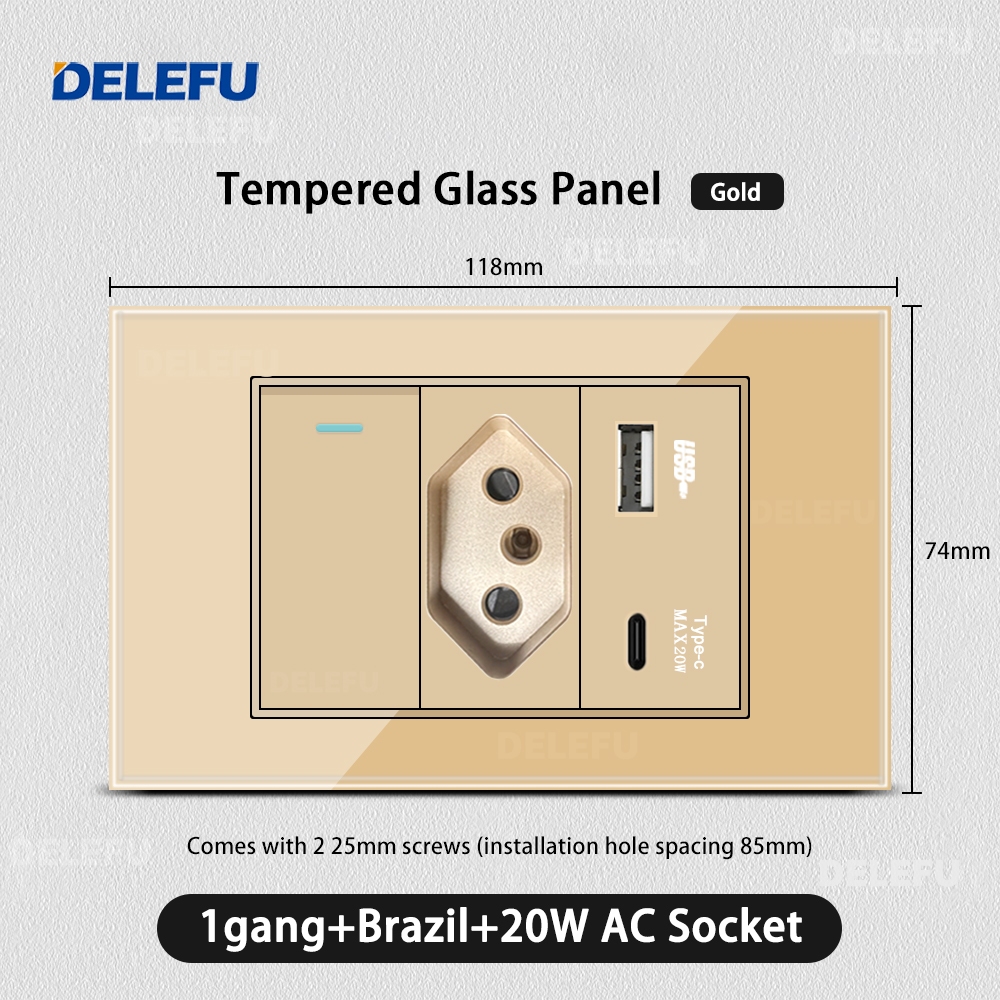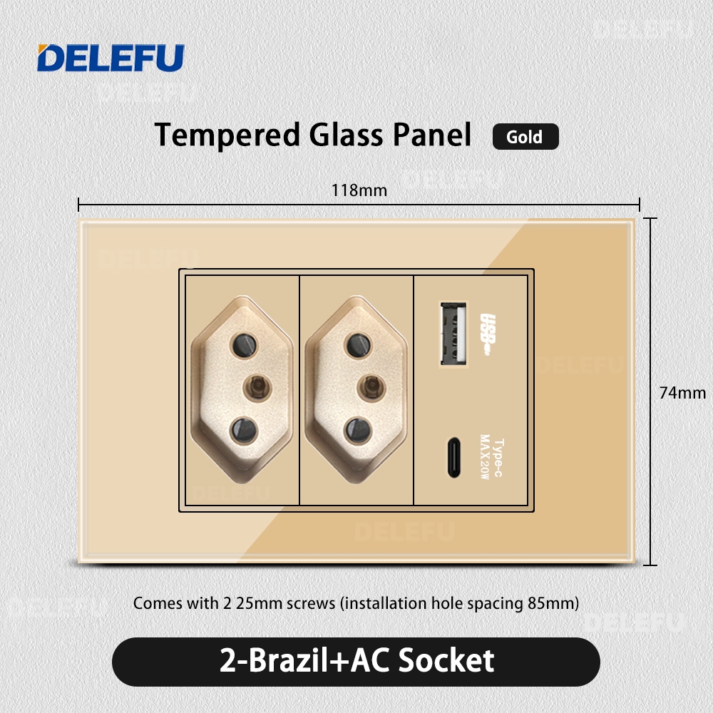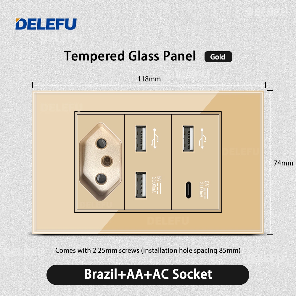 DELEFU 4 * 2 Vidro Dourado Temperado Tomada Padrão Dupla USB Tipo C Interruptor De Parede 10A 20A