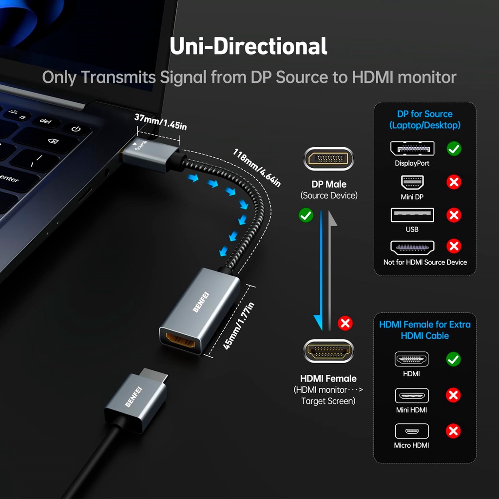 Adaptador DisplayPort p/Hdmi Benfei Macho/Fêmea Cinza