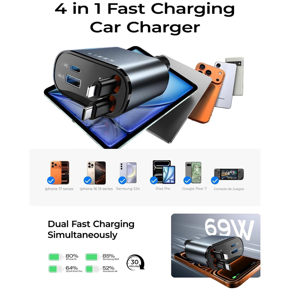 Carregador de Carro Lisen 69W Usb C/A/Ios Cabos Retrátil