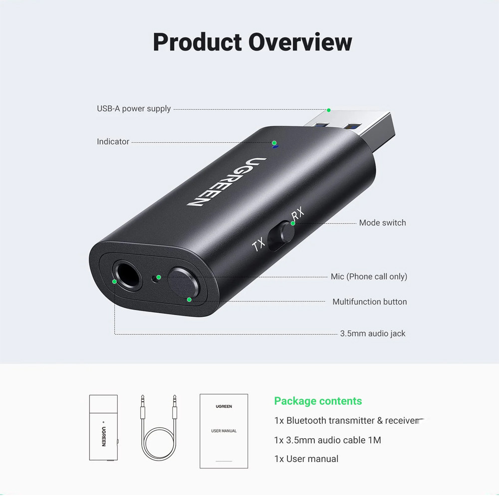 Transmissor Receptor Bluetooth Ugreen 2 in 1 Usb A Preto