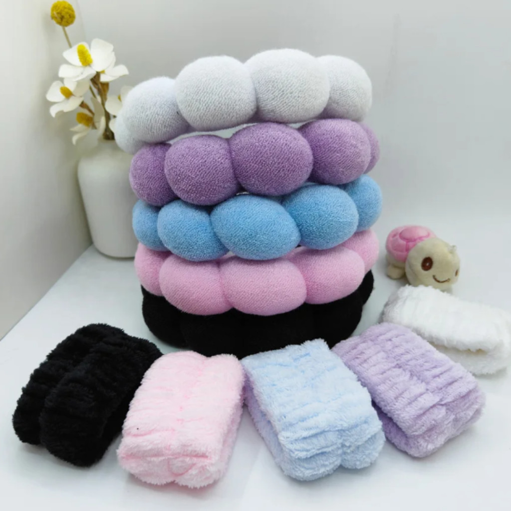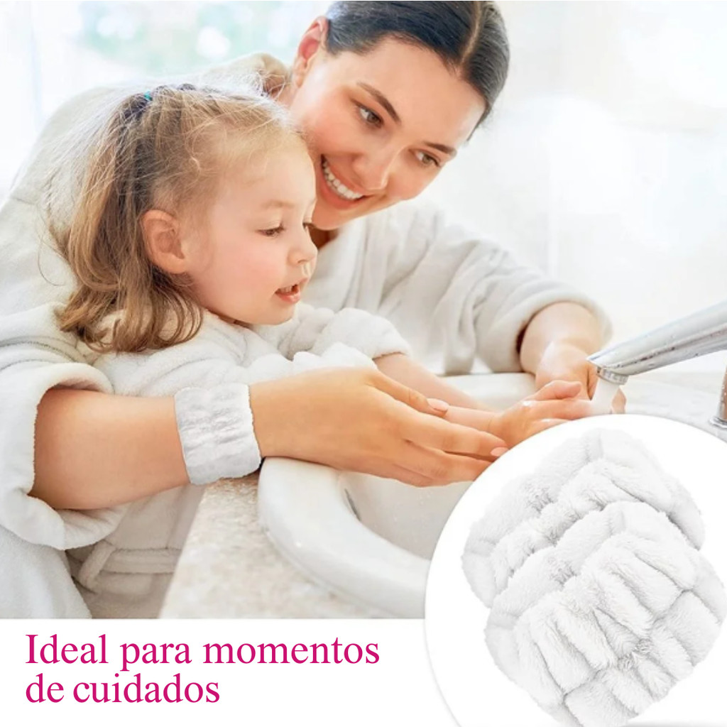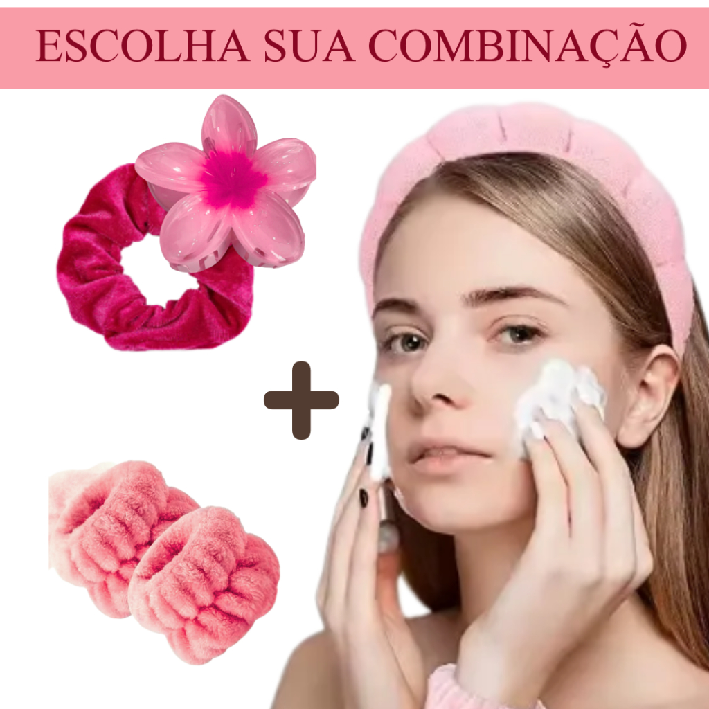 Kit Faixa Cabelo Tiara Nuvem Esponja + Presilha Flor e Xuxinha OU Pulseira Atoalhada - Skincare Make