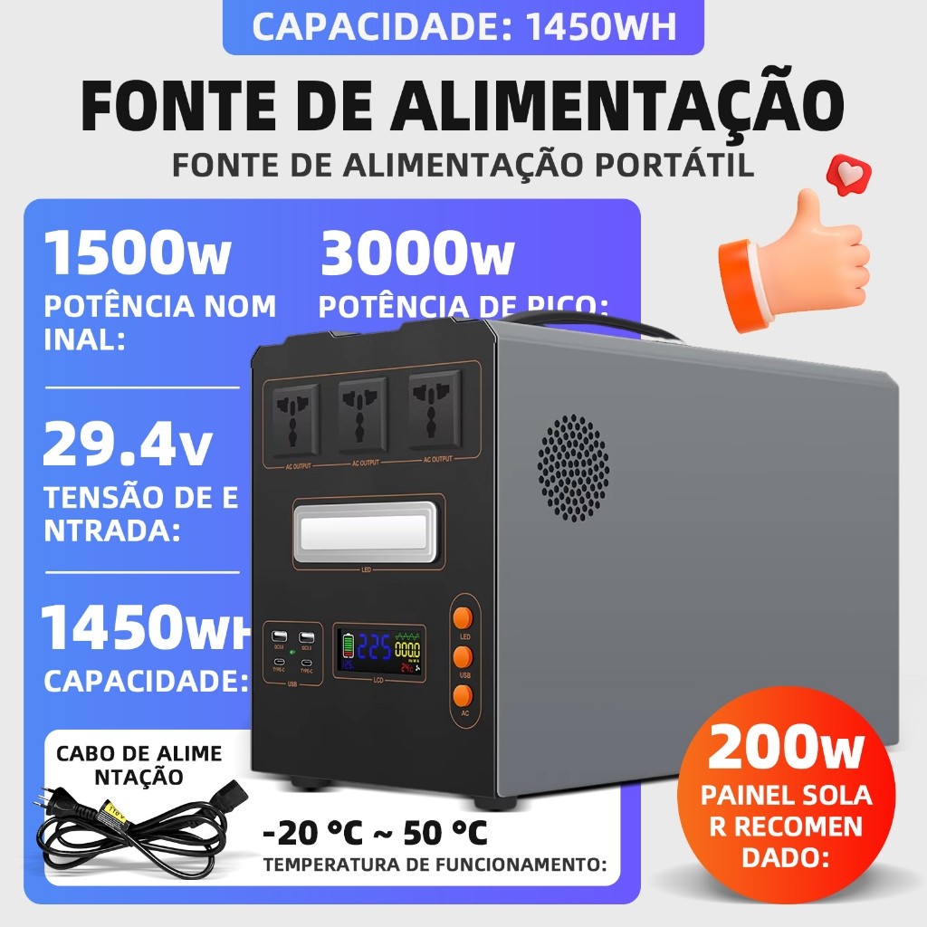 Estação de Energia Portátil 1500W - Saída Dual 110V/220V, USB-C Rápido e LED, 600W-1500W