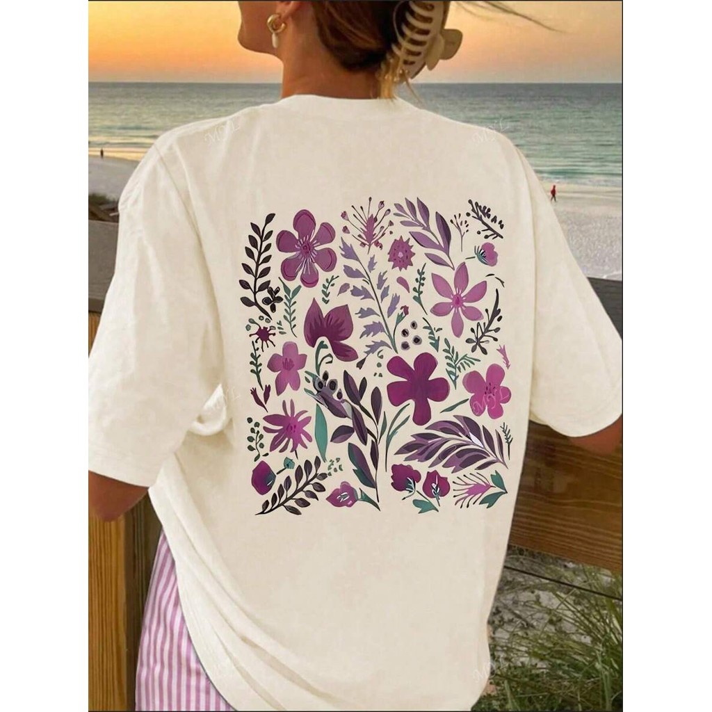 Camiseta Feminina Blusa Detalhes Flor Roxa 100% Algodão Fio 30.1 Lançamento T-shirt