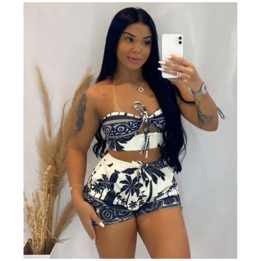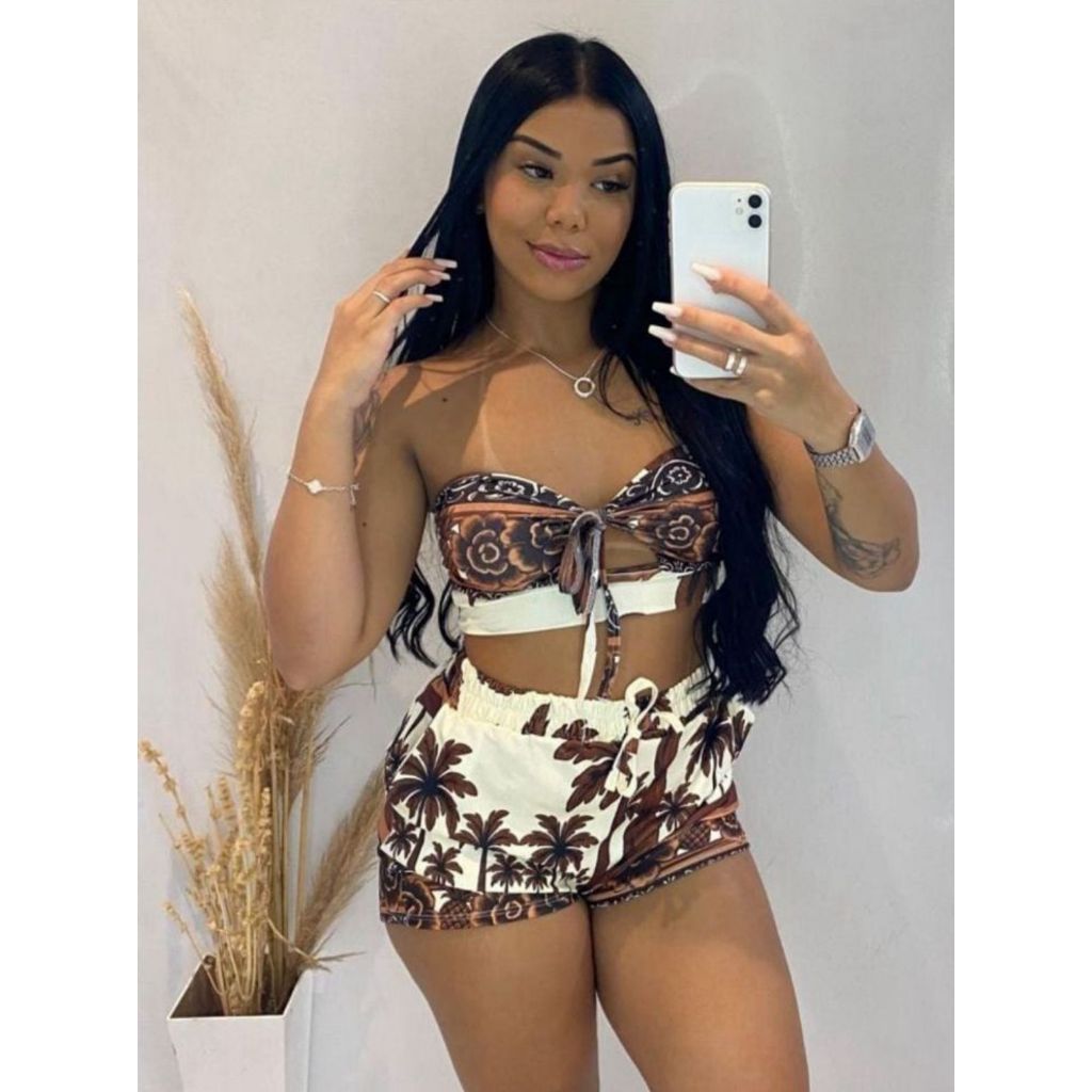 Conjunto Gabi - conjunto feminino estampado cropped amarração tomara que caia + short curto soltinho verão inspiração fa