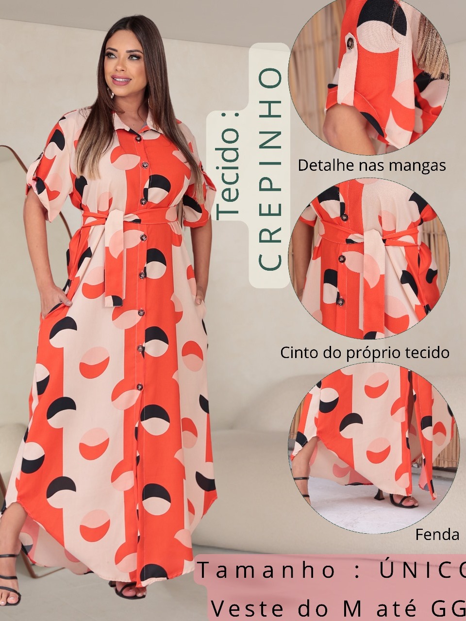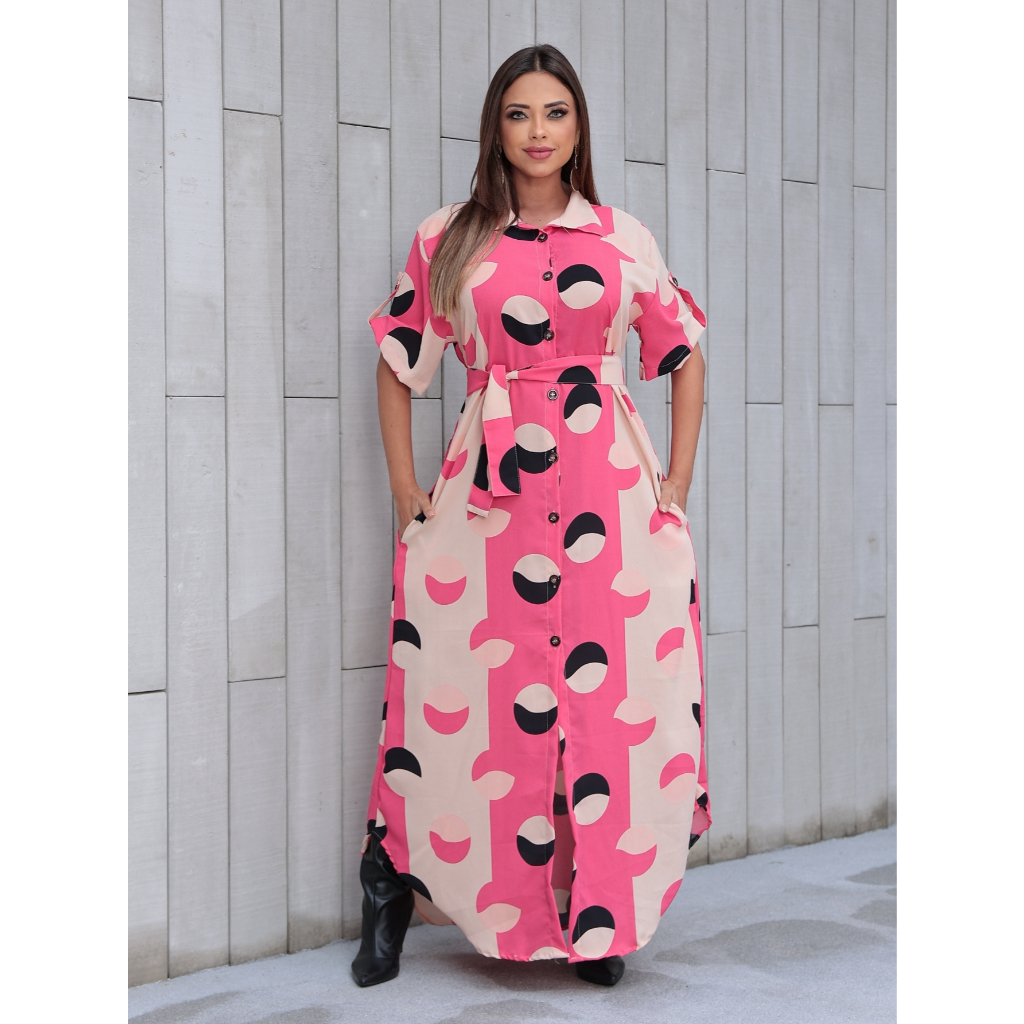 Vestido Feminino Longo Chemise com Manga Curta Botões Leve Verão Tecido Crepe Estamapdo bolsos