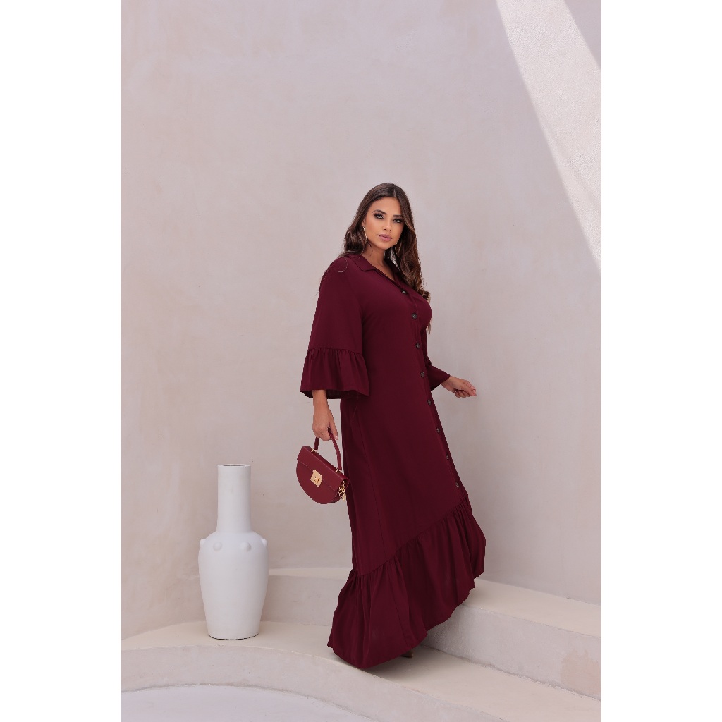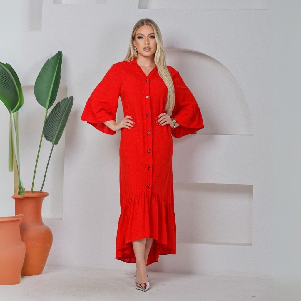 Vestido Feminino Longo Chemise Manga Longa Babado Casual Elegante Botões Funcionais Viscolinho