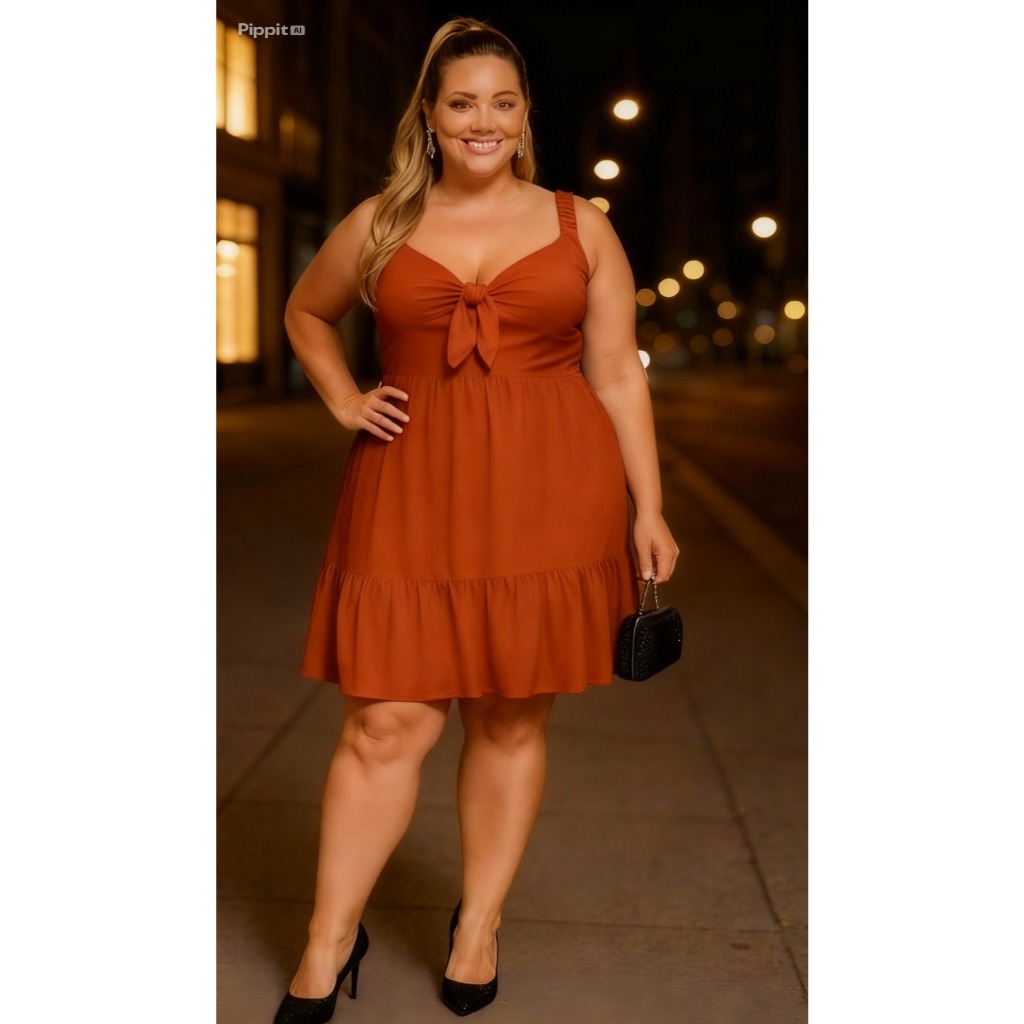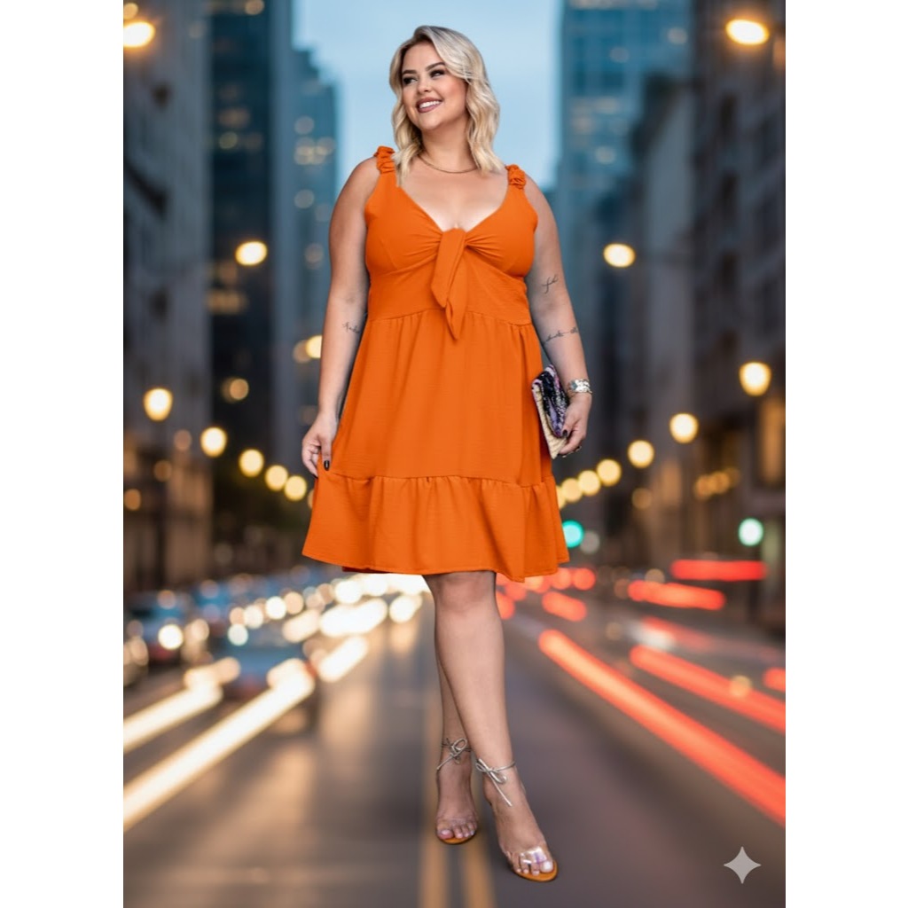 Vestido Feminino Plus Size Com Forro Tecido Duna Vibrantes Vermelho Laranja Preto Terracota | Tam. 46 ao 56