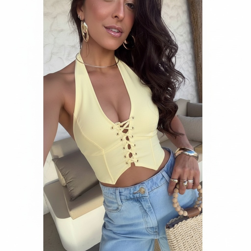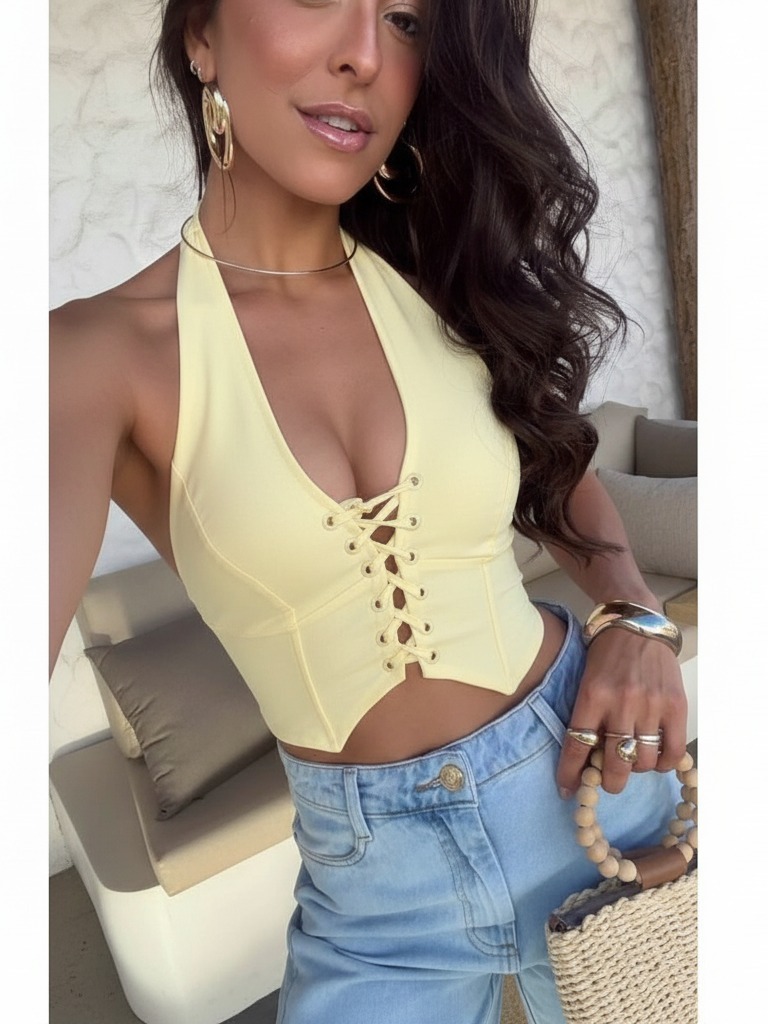 croppeds amarração frontal feminino decote V moda primavera look na moda
