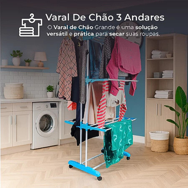 Varal De Chão Com Rodinhas Retrátil Articulado Dobrável 3 Andares Perfeito Para Lugares Pequenos Portátil