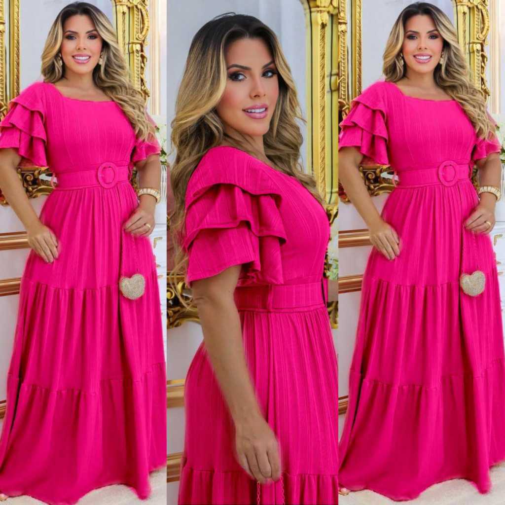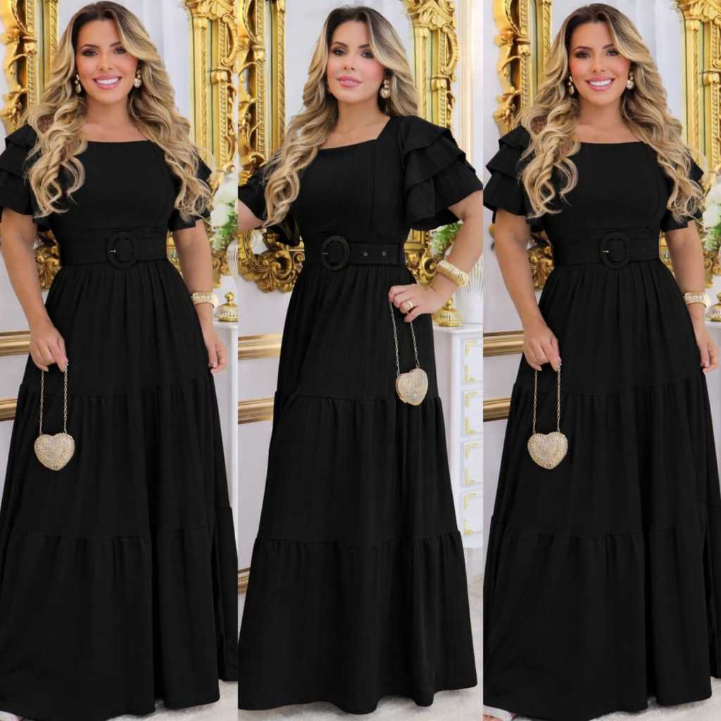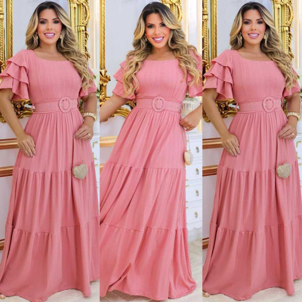 Vestido Longo Feminino Verão Manguinha Curta de Babado Duplo com Cinto (REF 57 e 57A)