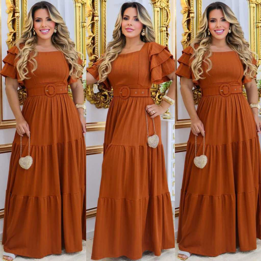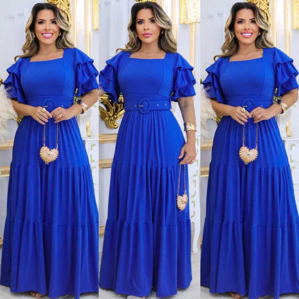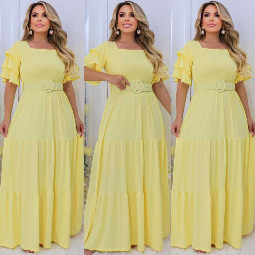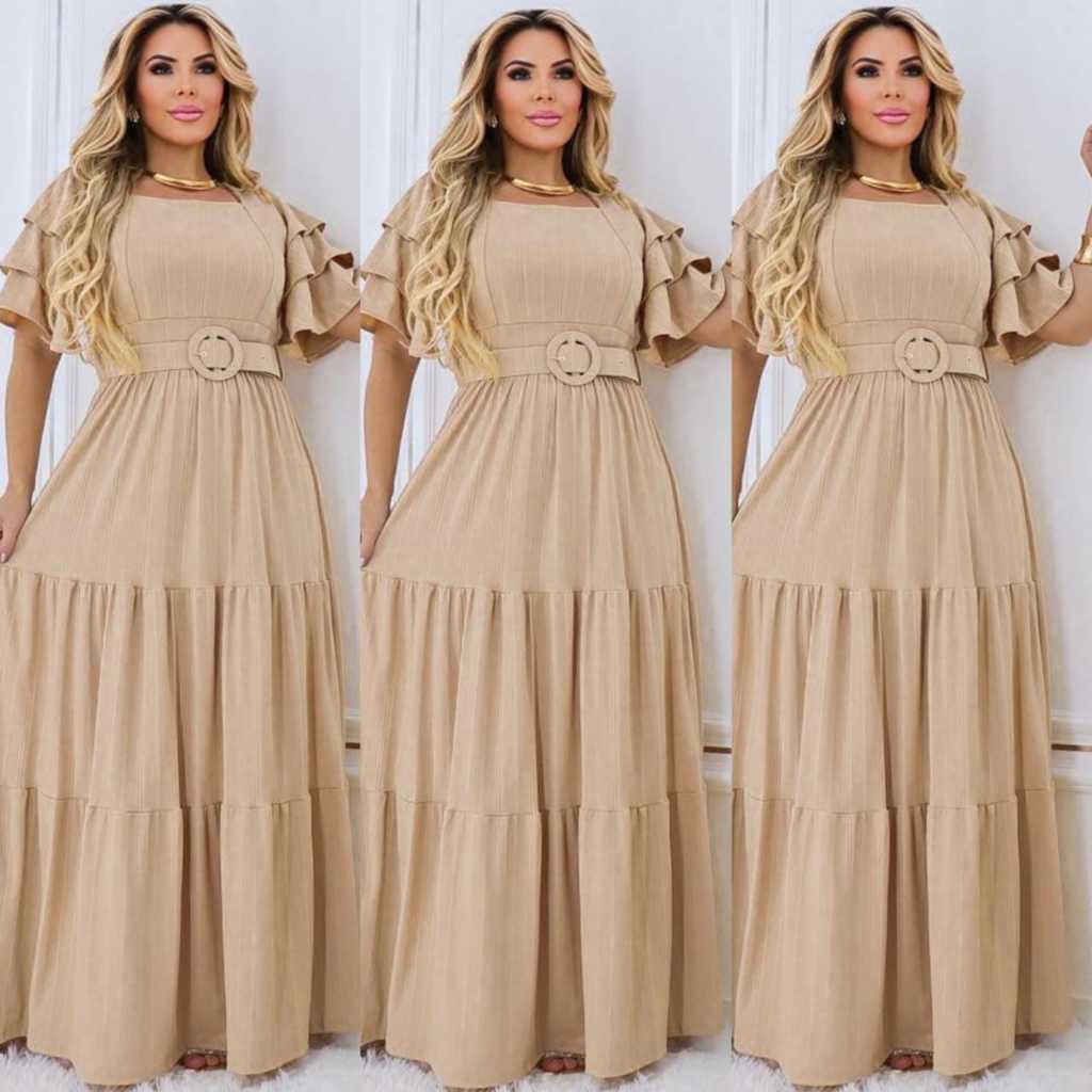 Vestido Longo Feminino Verão Manguinha Curta de Babado Duplo com Cinto (REF 57 e 57A)