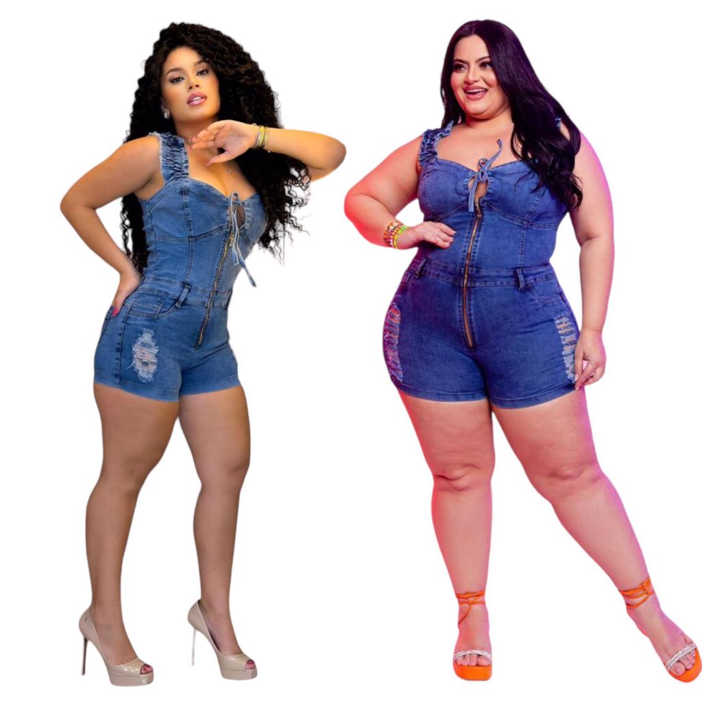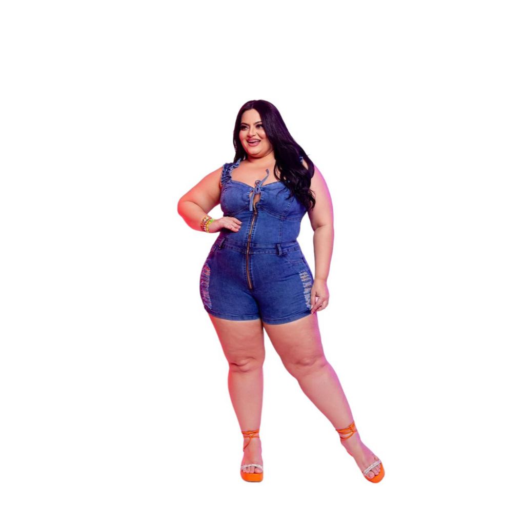 Macaquinho jeans com lycra cós alto fechamento em zipper