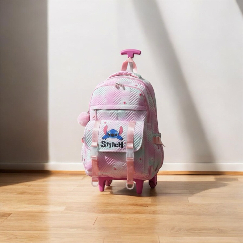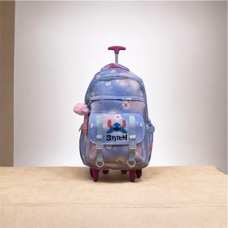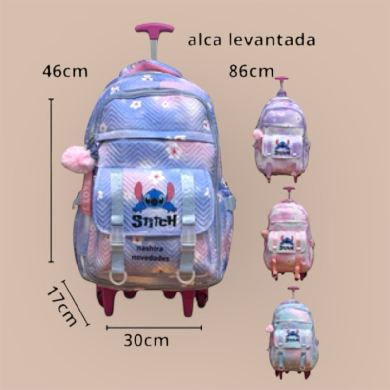 mochila escolar de rodinhas do Stitch, com estampa tie-dye, compartimento para notebook e chaveiro