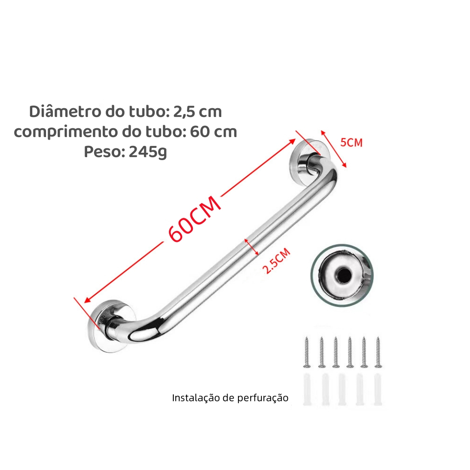 Barra de Apoio de Segurança Inox Para Banheiro, Idosos e Deficientes 60cm