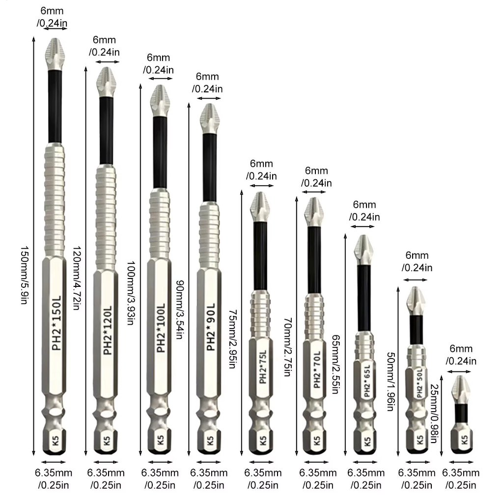 Kit 9 Ponta Bits Magnéticas K5 Ph2 Philips Alta Dureza e Resistencia Parafusadeira