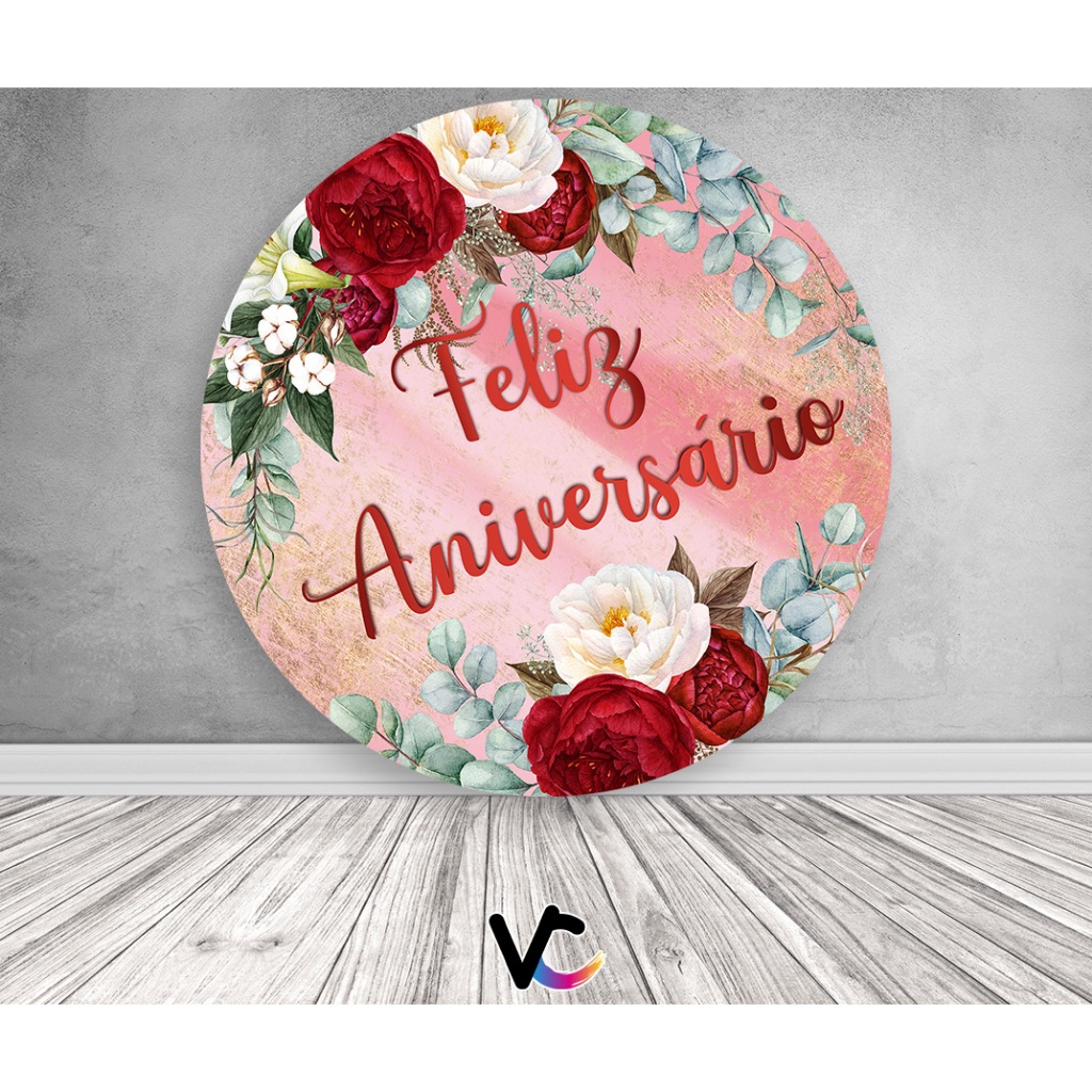 Painel De Festa Redondo Em Tecido - Feliz Aniversário Marmorizado Floral 135