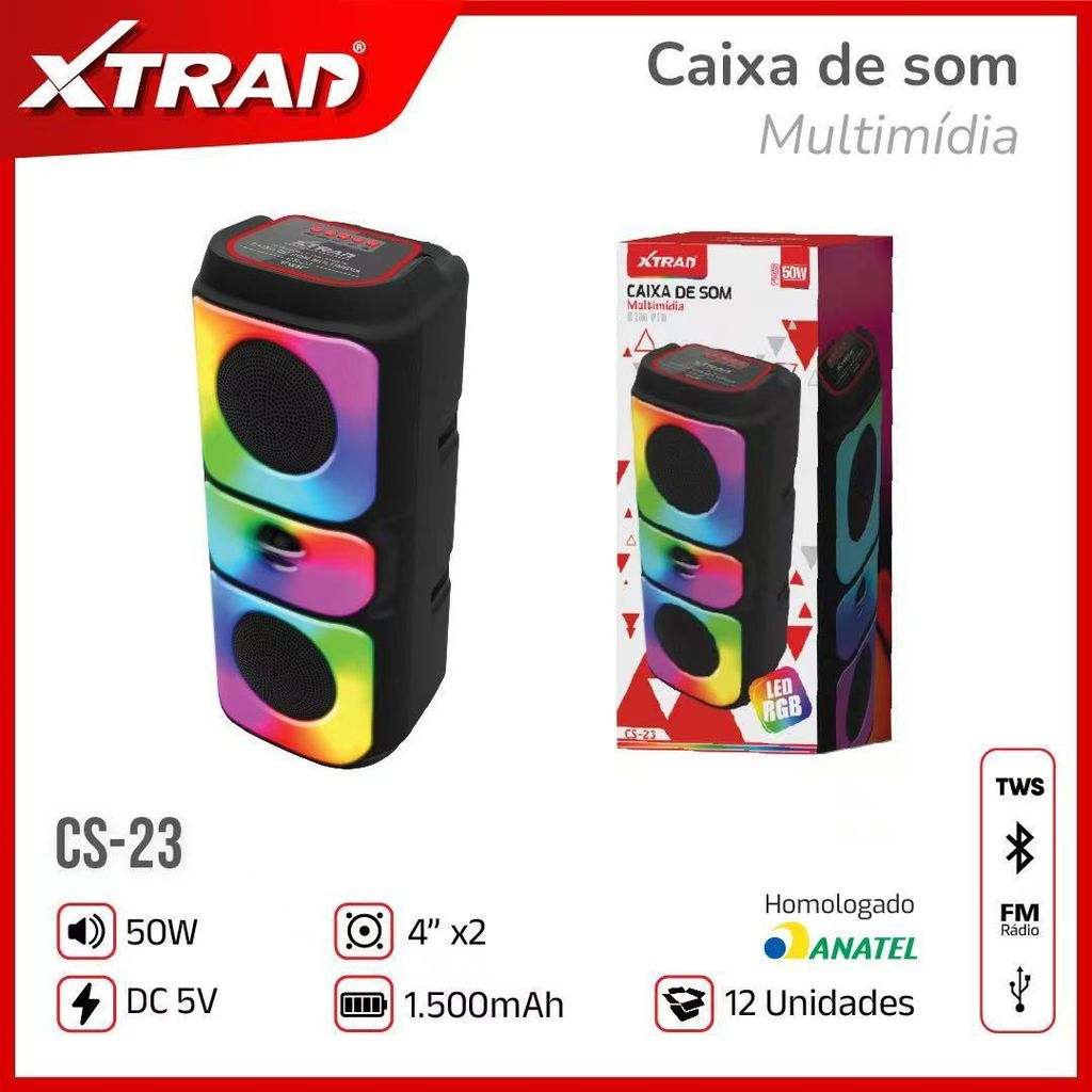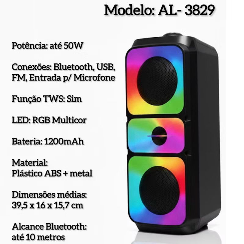 Caixa de Som Bluetooth Portátil 50W LED RGB TWS USB/FM Estéreo Potente c/ Microfone e Volume Ajustável